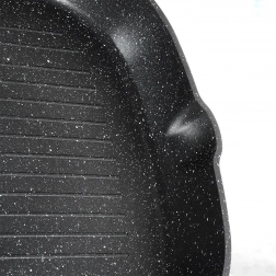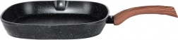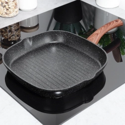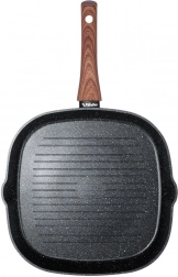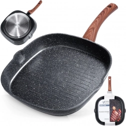 Négyzet alakú, 28 × 28 cm-es grillserpenyő masszív öntött alumínium testtel és tapadásmentes gránit bevonattal, amely látványos grillcsíkokat és egyenletes hőeloszlást biztosít. Kétoldali kiöntőcsőrrel a levek könnyű leöntéséhez, fa hatású ergonomikus nyéllel, és minden tűzhelytípushoz, beleértve az indukciót is, valamint mosogatógépben mosható.