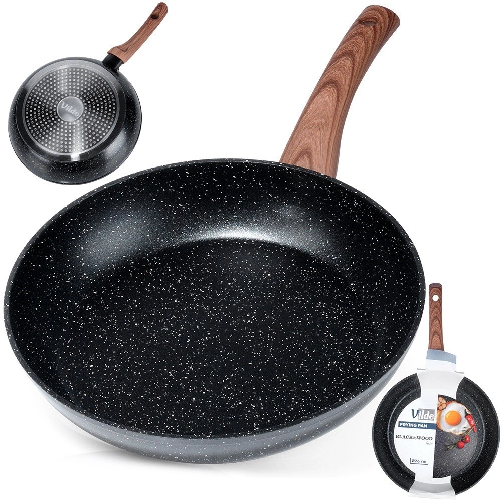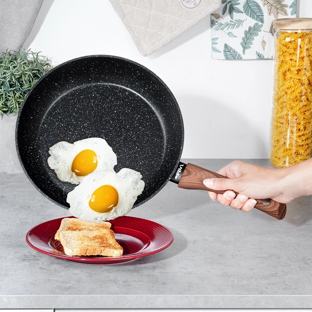 Népszerű serpenyő modern, fekete és fa kombinációban, praktikus segítőtárs sütéshez és pároláshoz. A tartós alumínium test minőségi gránit tapadásmentes bevonattal könnyű ételkioldást és egyszerű tisztítást garantál. Ideális húshoz, zöldséghez, tojáshoz és gyors melegítéshez.