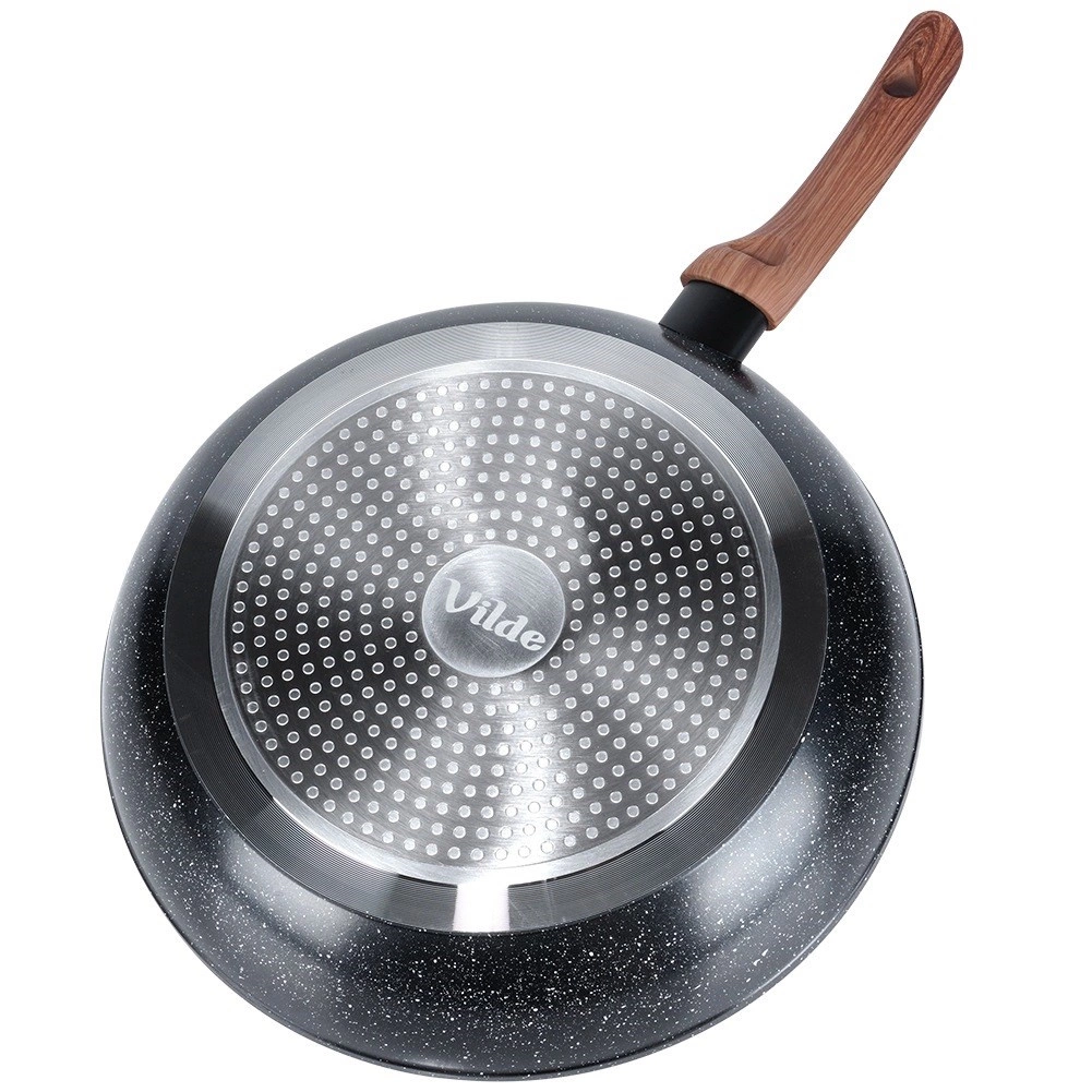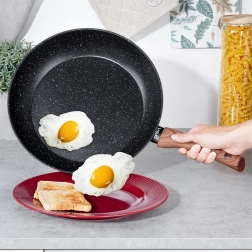 Ez a modern gránit serpenyő az elegáns fekete és fa kombinációjával megkönnyíti a mindennapi főzést. A masszív alumíniumöntvénynek és a többrétegű tapadásmentes bevonatnak köszönhetően húst, zöldséget és tojást is minimális olajjal, leégés nélkül készíthet. A sík, stabil talp gyors hőfelvételt és egyenletes hőeloszlást biztosít a teljes felületen.