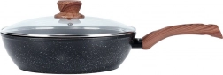 Mély, 28 cm átmérőjű gránit serpenyő üvegfedővel az egyszerű sütéshez és pároláshoz. A tapadásmentes felületnek köszönhetően minimális zsiradékkal főzhet, egyenletesen vezeti a hőt, és minden tűzhelytípushoz, beleértve az indukciót is, alkalmas. Az ergonomikus, fa hatású, nem melegedő nyél kényelmes fogást ad, a serpenyő mosogatógépben mosható.