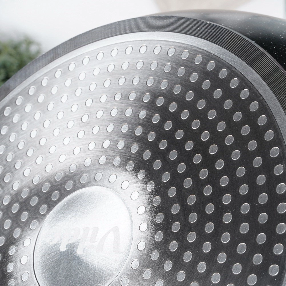 A masszív alumíniumöntvény gyors és egyenletes felmelegedést biztosít, ami időt és energiát takarít meg. A tapadásmentes gránit felület minimalizálja az odaégést és megkönnyíti a tisztítást. Az ergonomikus nyél csúszásgátló kialakítással főzés közben sem melegszik fel, a végén lévő nyílás pedig megkönnyíti a felakasztást.