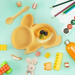 Tegye szórakoztatóvá és rendezetté minden étkezést. A nyuszi alakú szilikon tányér 3 rekeszre osztott kialakítása segít az ételek áttekinthető és higiénikus tálalásában. A nagy tapadókorong az alján stabilan tartja az asztalon vagy az etetőszéken, csökkentve a kilöttyenés kockázatát.