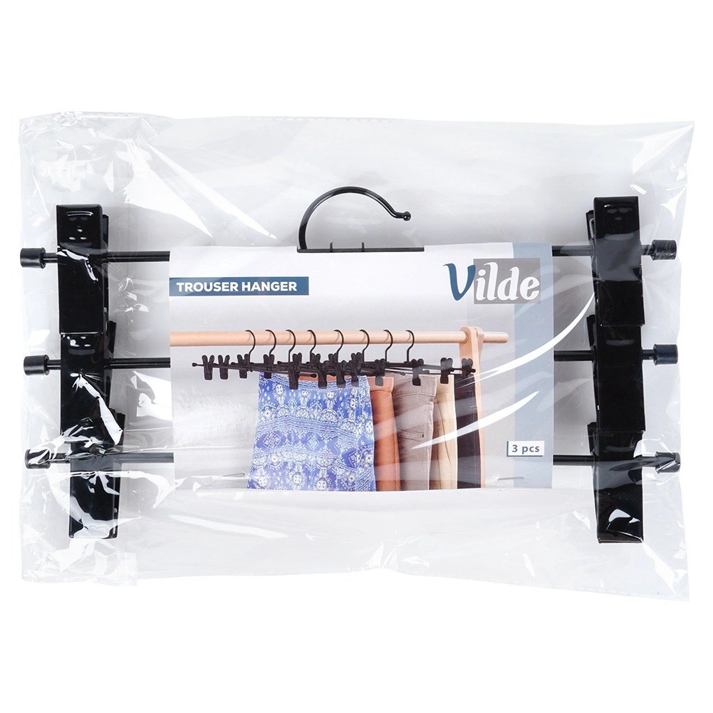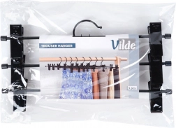 Praktikus, három darabból álló fém vállfa szett állítható csipeszekkel nadrágokhoz és szoknyákhoz. Masszív kialakításuk és a csúsztatható fogók biztonságosan a helyén tartják a ruhákat, helyet spórolnak a szekrényben és segítenek megelőzni a gyűrődést. Tartós fém, erős rugós csipeszek védőbetétekkel és sokoldalú felhasználás különféle ruhadarabokhoz.