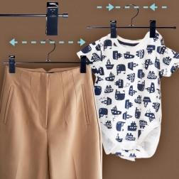 Minden vállfa csúsztatható csipeszeket kínál a szélesség testreszabásához különböző méretekhez – a gyerekruhától a női és férfi nadrágokig, szoknyákig vagy sortokig. A helytakarékosság és a gyűrődés elleni védelem ápolt megjelenést biztosít a ruháknak.