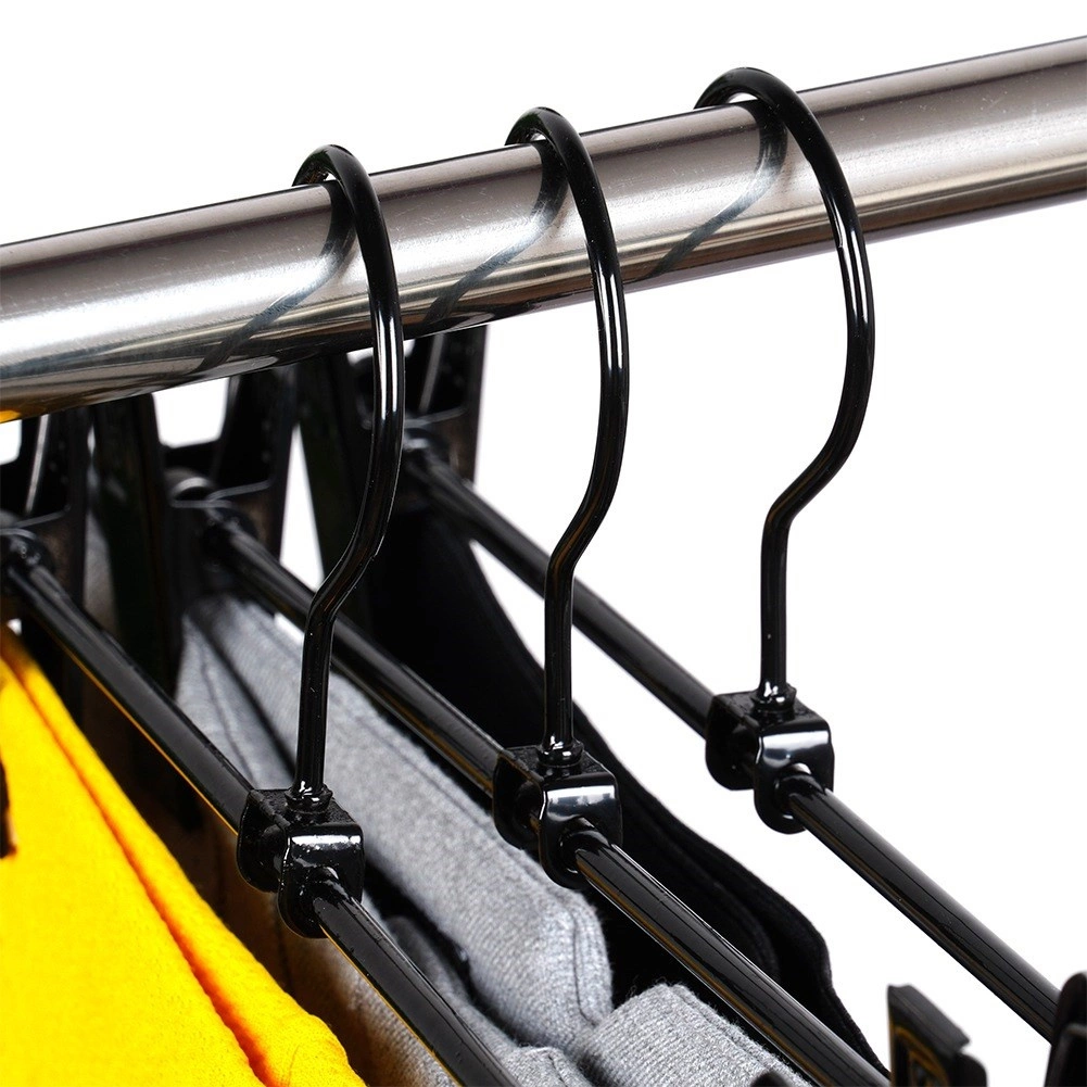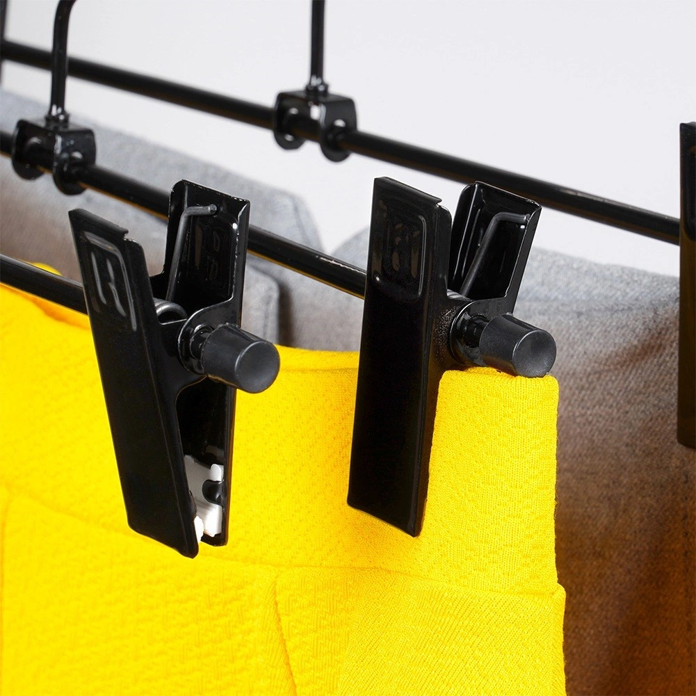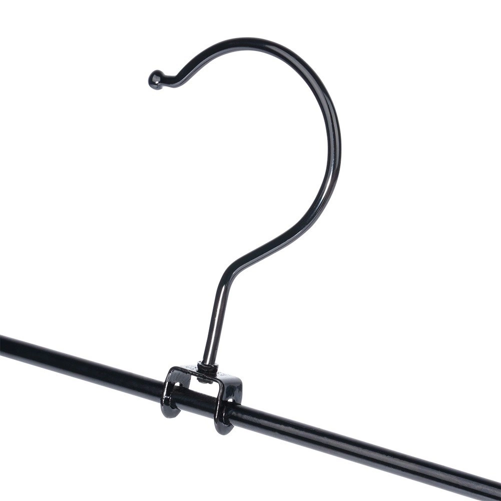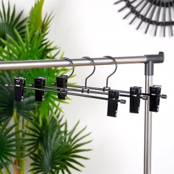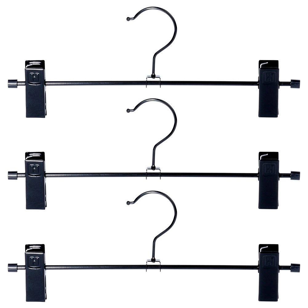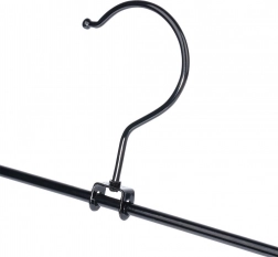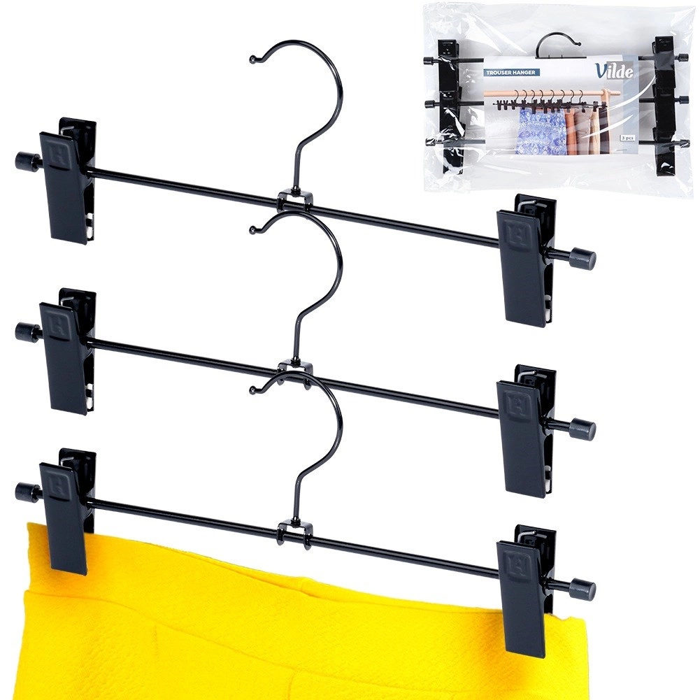 A 3 darabos, csipesszel ellátott masszív vállfa készlet ideális a ruhatár áttekinthető rendszerezéséhez. Az állítható csipeszek védőbetétekkel szilárdan tartják az anyagot sérülés nélkül, és megakadályozzák a lecsúszást. A fekete, porfestett fém könnyen karbantartható, és elegánsan mutat bármely szekrényben.
