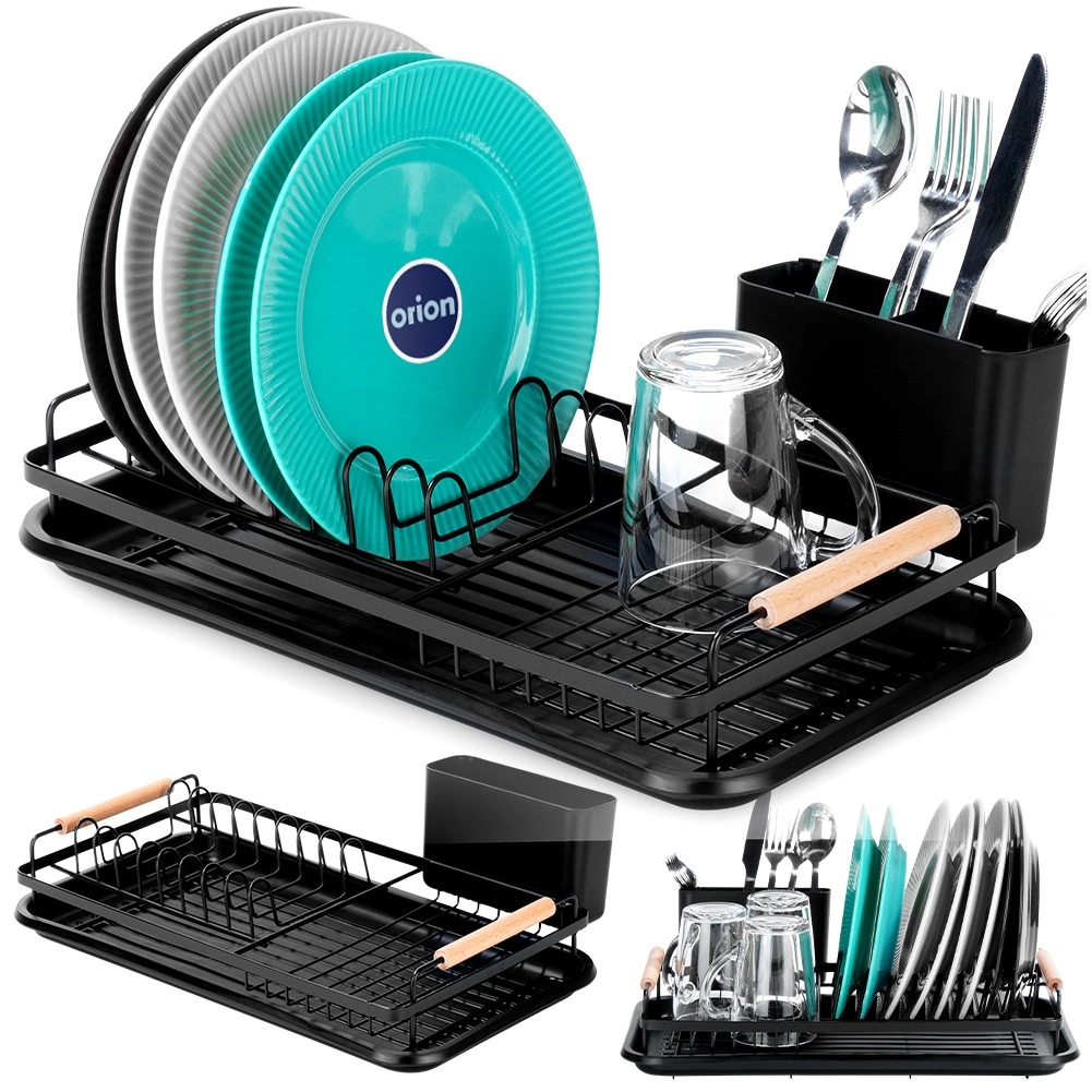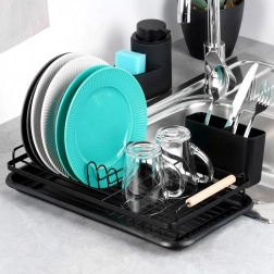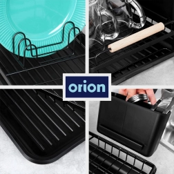 Stílusos és kompakt edényszárító 43 × 23,5 × 9,5 cm méretben, tányérok, poharak és evőeszközök számára. Rendelkezik kivehető csepegtetőtálcával, levehető evőeszköztartóval és fa fogantyúkkal az egyszerű hordozáshoz. A tartós, matt fekete fémváz megóvja a munkalapot a víztől és rendben tartja a konyhát.