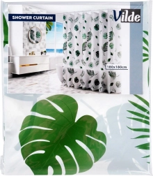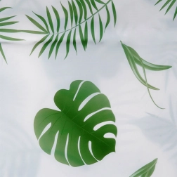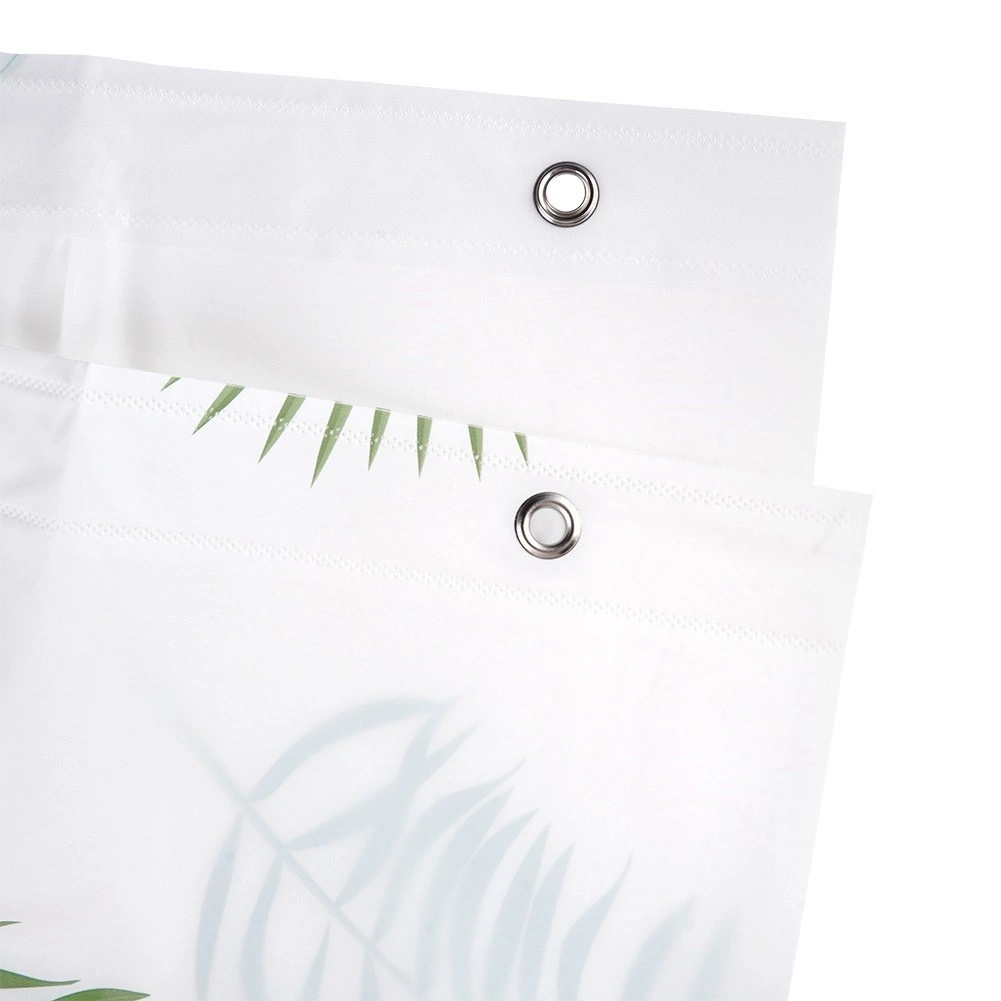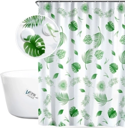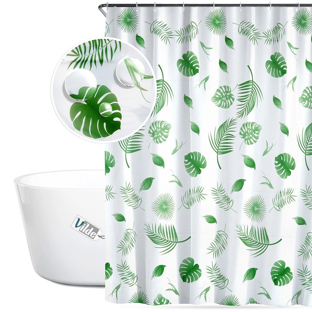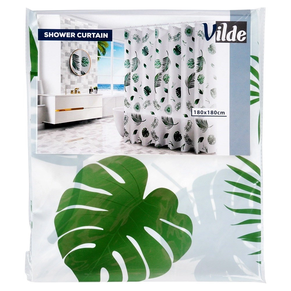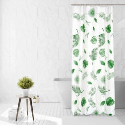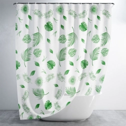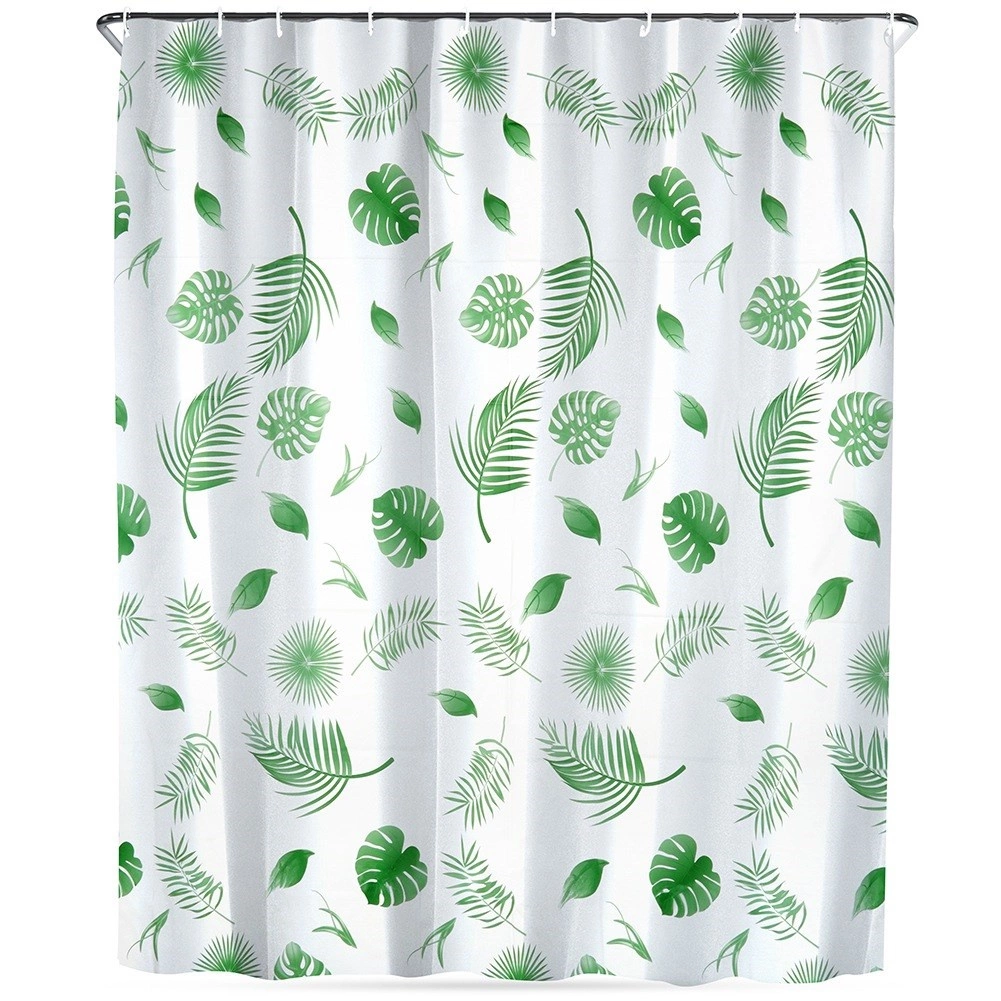 Stílusos, 180 × 180 cm-es zuhanyfüggöny környezetbarát PEVA anyagból, zöld leveles mintával és 12 darab kampóval. Biztosít magánszférát, hatékony védelmet a fröccsenő víz ellen, továbbá könnyen tisztítható és tartós a mindennapi használathoz.