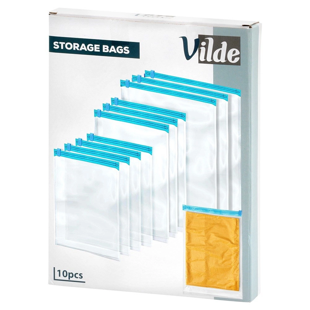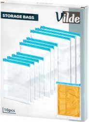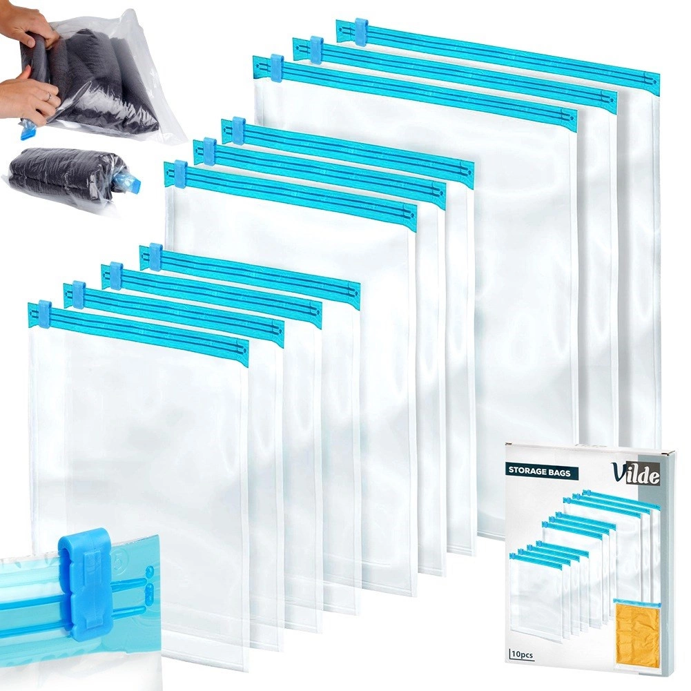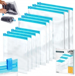 Praktikus, 10 darabos vákuumos ruhazsák-készlet három méretben a maximális helymegtakarításért utazáskor és otthon. A csúszózáras kialakítás légmentes zárást biztosít, véd a nedvességtől, portól és szagoktól, és a átlátszó kivitelnek köszönhetően a tartalom mindig jól látható. Egyszerű kompresszió porszívó nélkül – csak fel kell tekerni a zsákot, és akár 70% helyet takaríthat meg.