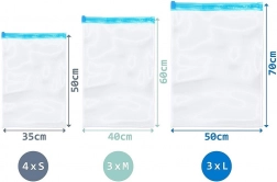 A készlet 10 darab tartós kompressziós zsákot tartalmaz megbízható csúszózárral, többszöri használatra. A három méretnek köszönhetően könnyedén elhelyezhet pólókat, pulóvereket, kabátokat és kiegészítőket, akár utazóbőröndben, akár otthoni szekrényben. Az átlátszó anyag lehetővé teszi a tartalom gyors ellenőrzését felnyitás nélkül.