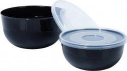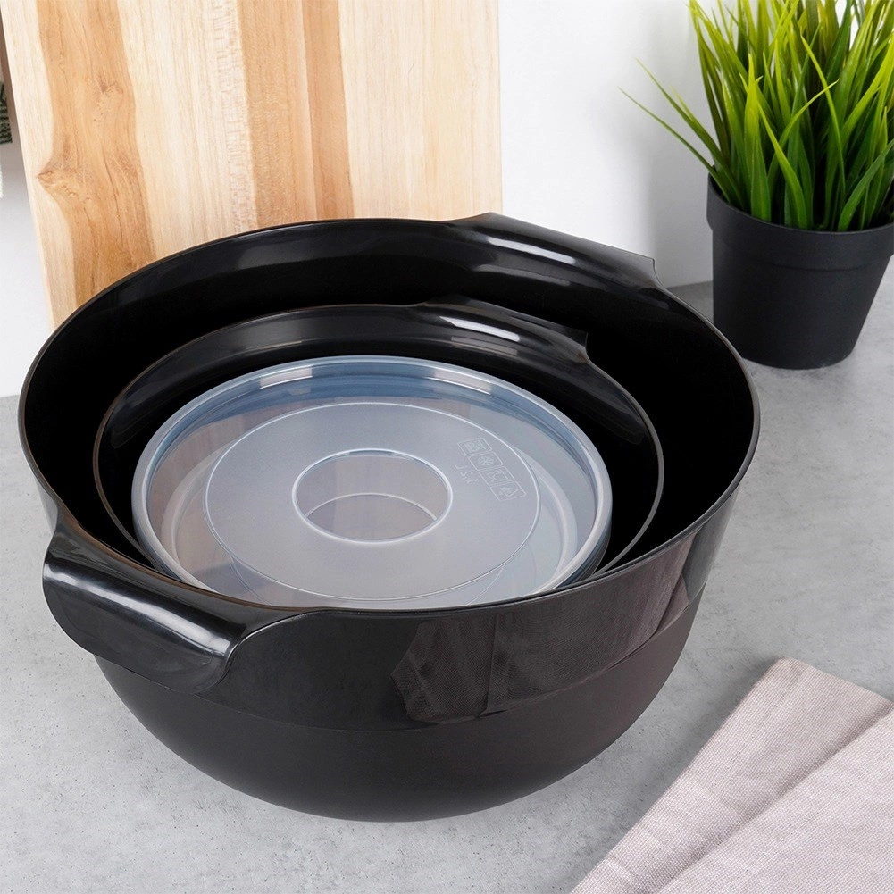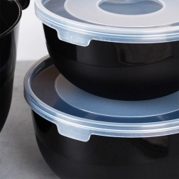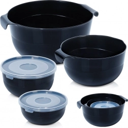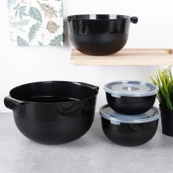 Ezzel a 6 darabos készlettel négy tartós, modern fekete tálat és két átlátszó fedőt kap a könnyű tároláshoz. A kisebb, fedeles tálak ideálisak előkészített alapanyagok hűtőben való tárolására, a nagyobb, fogantyúval és kiöntővel ellátott tálak pedig megkönnyítik a tészták keverését, habverést és a palacsintatészta kiöntését.