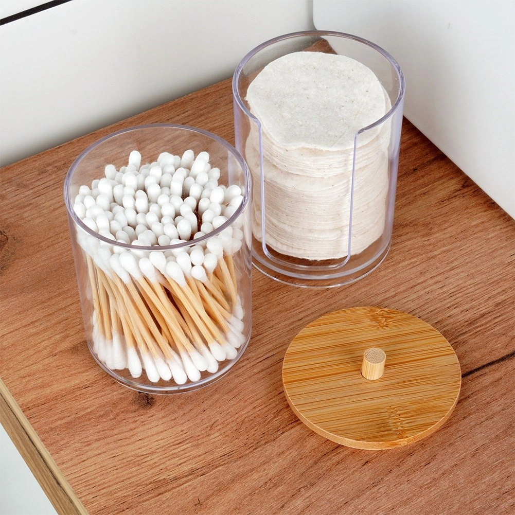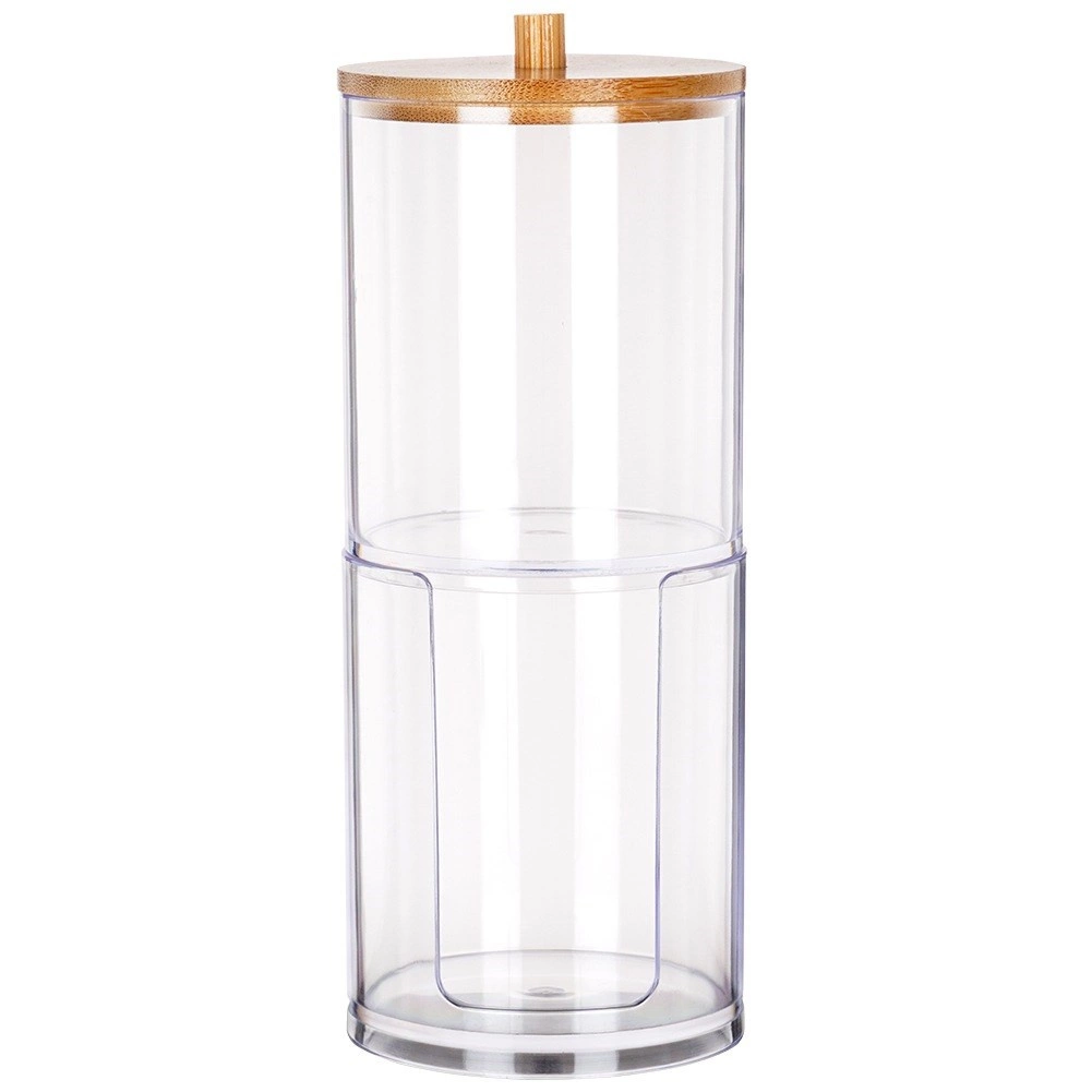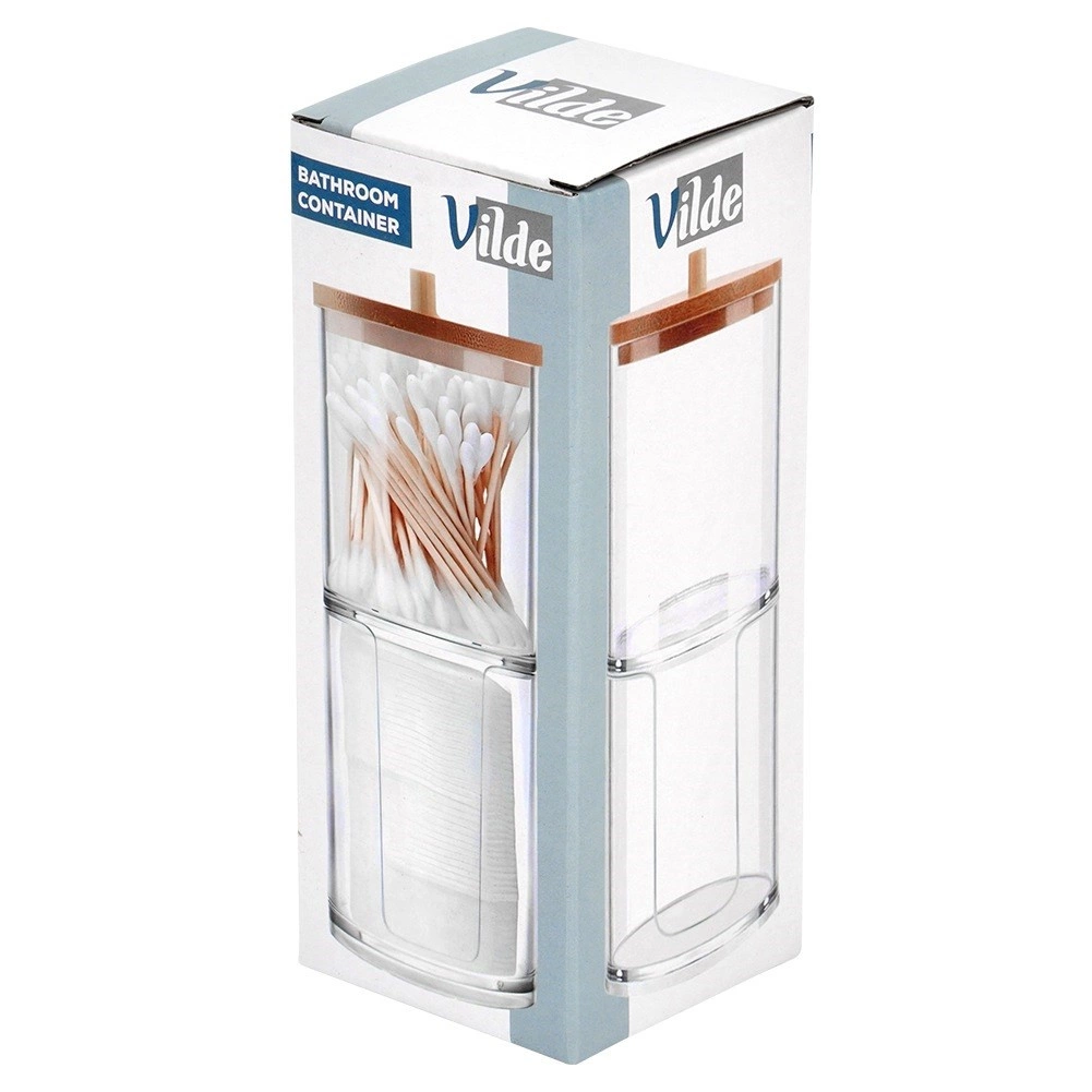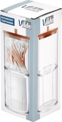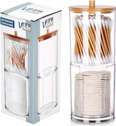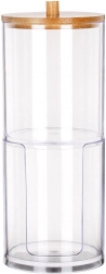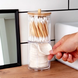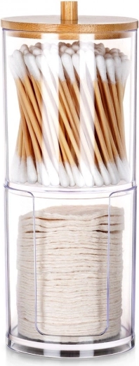 Elegáns és funkcionális kiegészítő minden fürdőszobába. Két külön rekesz a tiszta akrilból higiénikus és átlátható tárolást biztosít a vattapálcikák és a kerek vattakorongok számára. A felső részt fogantyús bambusz fedél fedi, az alsó szekció elülső kivágással a könnyű adagoláshoz rendelkezik.