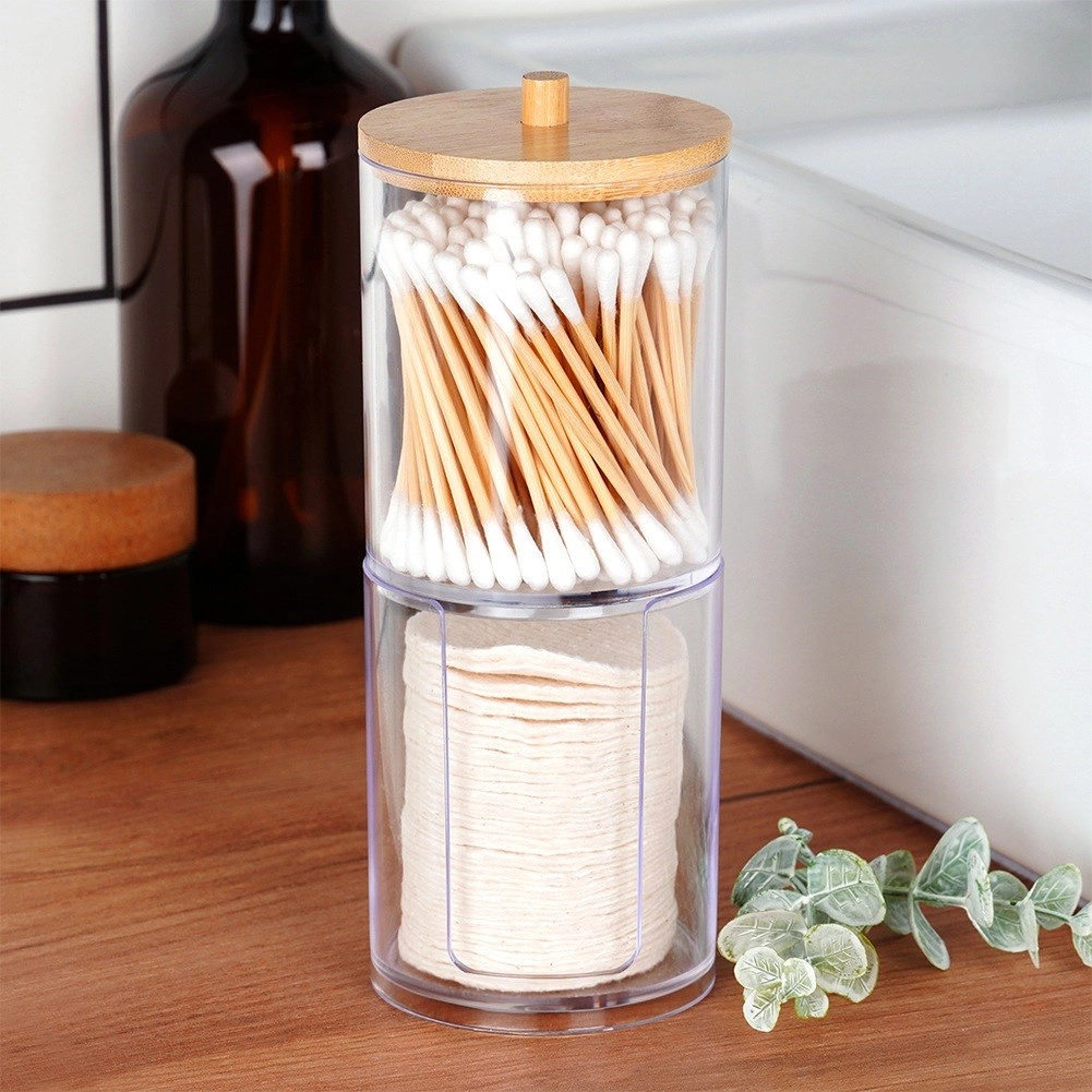 Tartsd rendben a fürdőszobát ezzel a két szintű, 2 az 1-ben rendezővel vattapálcikákhoz és sminklemosó vattakorongokhoz. Az átlátszó akril azonnali készletellenőrzést tesz lehetővé, a bambusz fedél megvédi a portól, az alsó rész pedig praktikus korongadagolót kínál a gyors használathoz. A kompakt, függőleges kialakítás helytakarékos a mosdópulton.