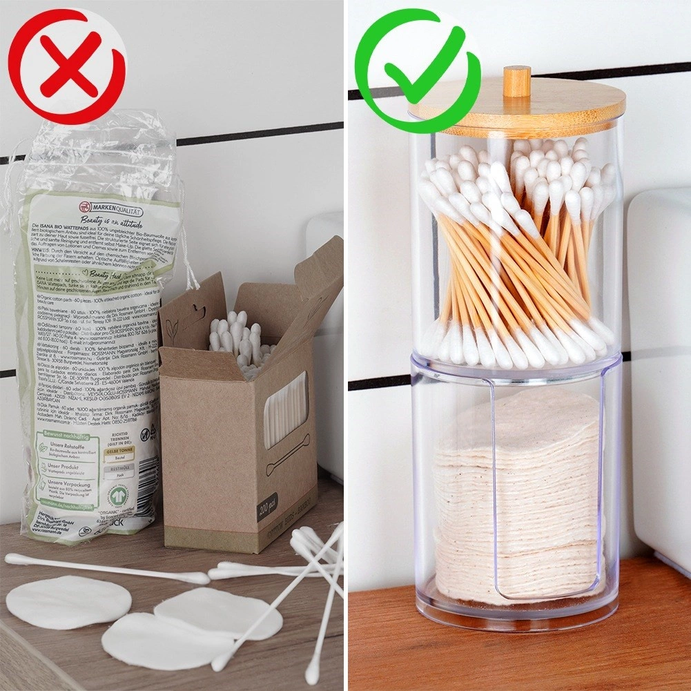 Válaszd szét a vattapálcikákat és a vattakorongokat egy kompakt rendezőben. Az átlátszó anyag azonnali áttekintést és elegáns megjelenést biztosít.