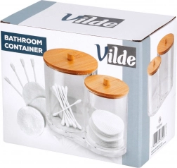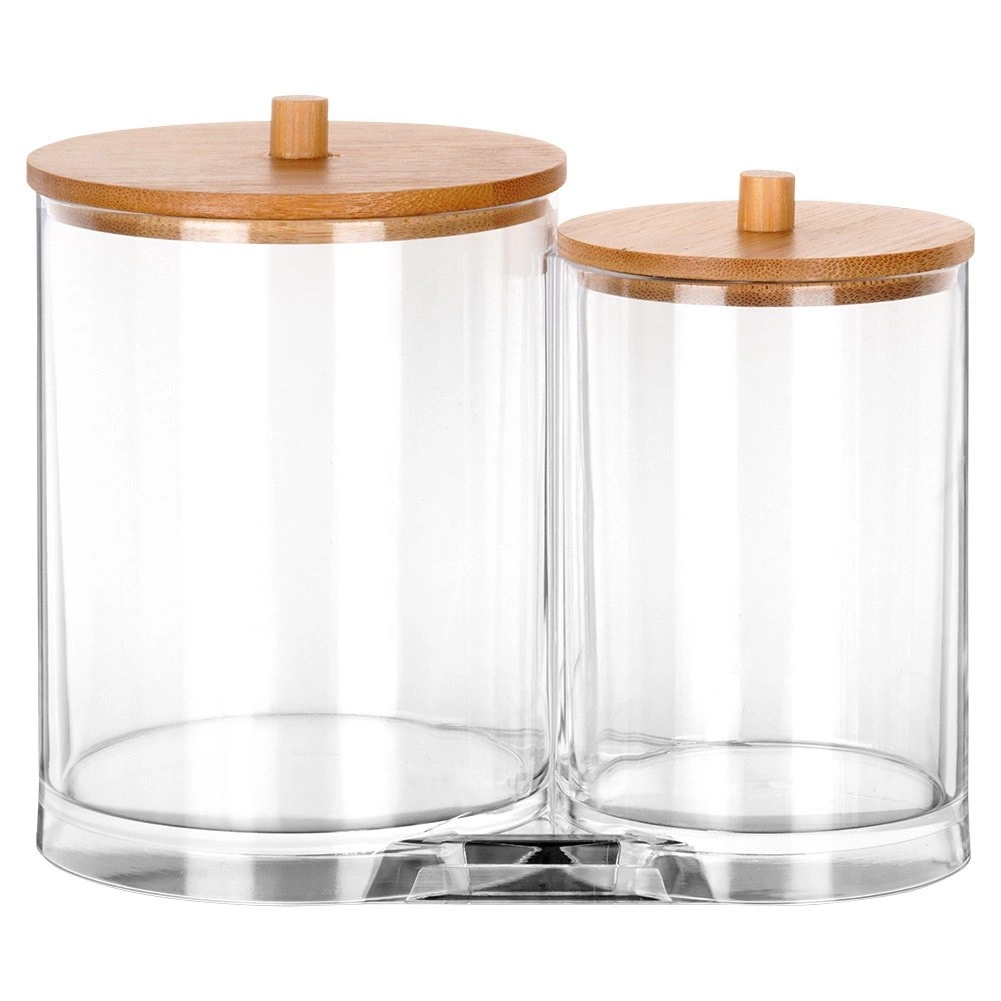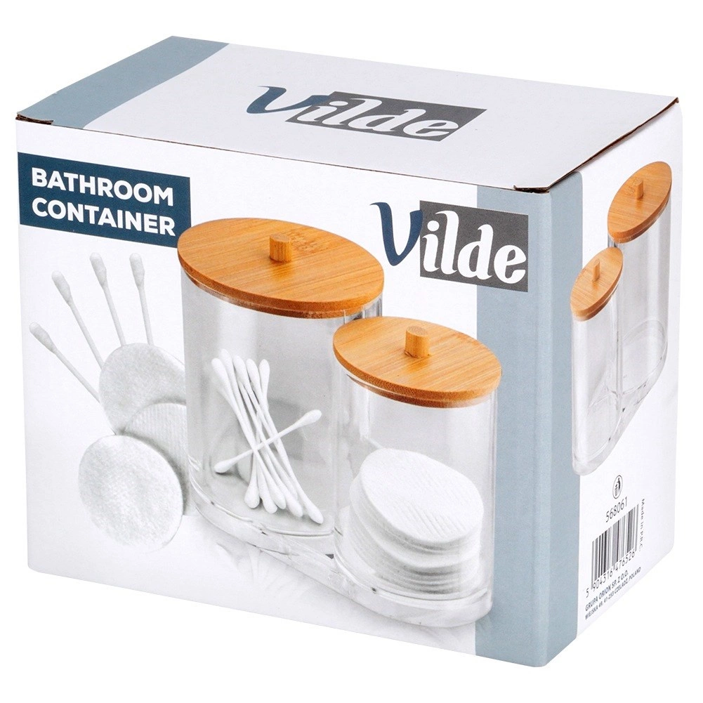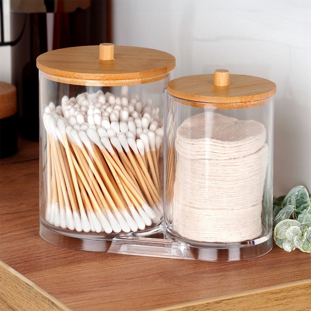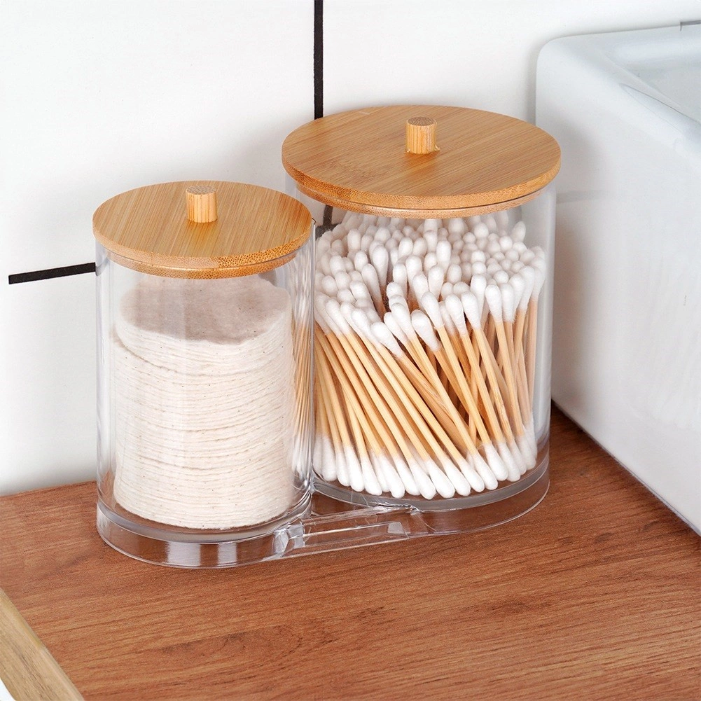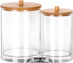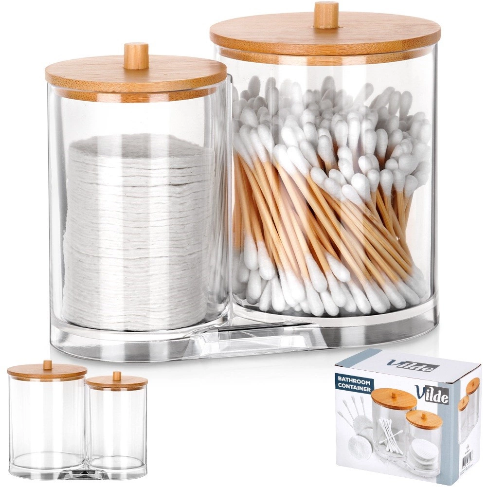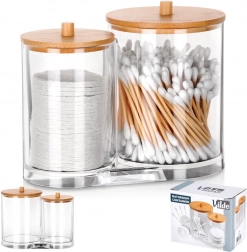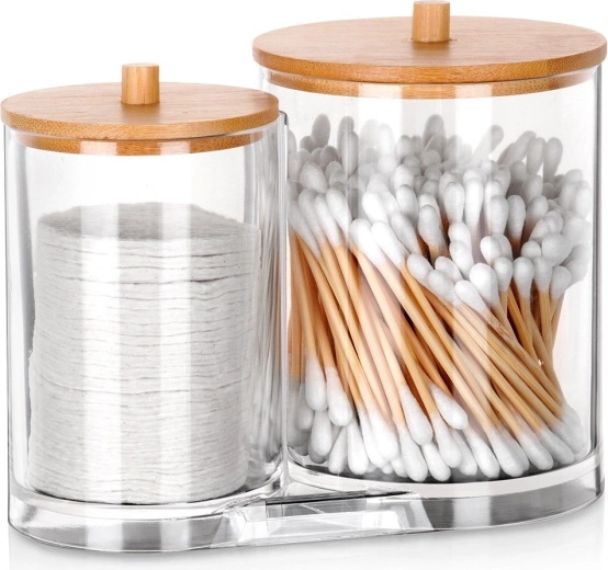 Elegáns és funkcionális megoldás a mindennapi fürdőszobai rutinhoz. A két összekapcsolt, tartós, átlátszó akril tartály külön helyet biztosít a vattapálcikáknak és az arctisztító korongoknak, így minden tiszta, könnyen elérhető és szépen rendezett marad. A praktikus fogantyúval ellátott bambusz fedelek védik a tartalmat a portól, és természetes, modern megjelenést adnak.