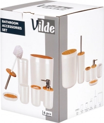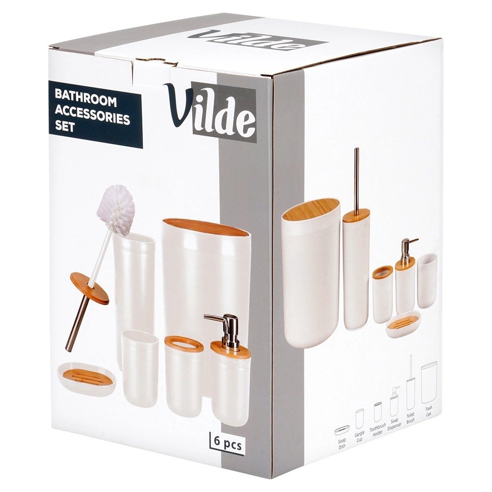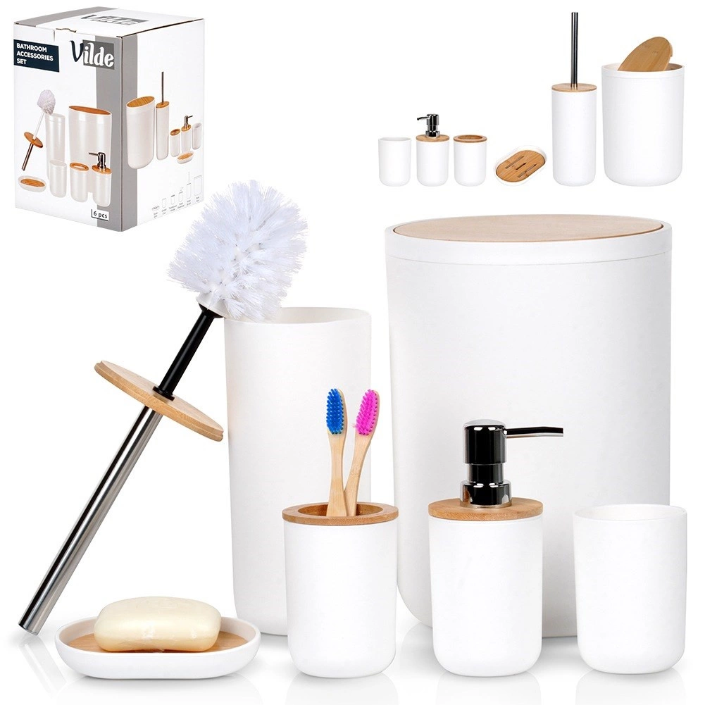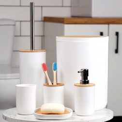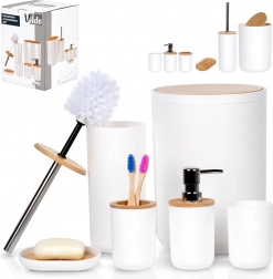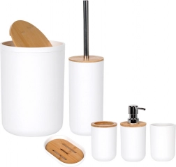 A szett egységesíti a fürdő megjelenését és mindent biztosít, amire szükség van: adagoló, szappantartó, fogkefetartó, pohár, WC-kefe és szemetes. A minimalista fehér design bambusszal meleg és letisztult hatást kelt.