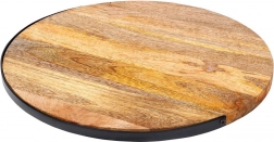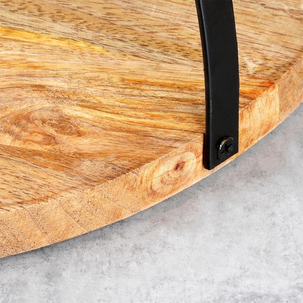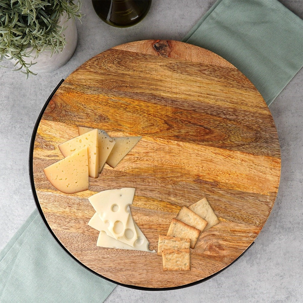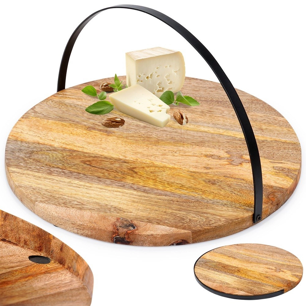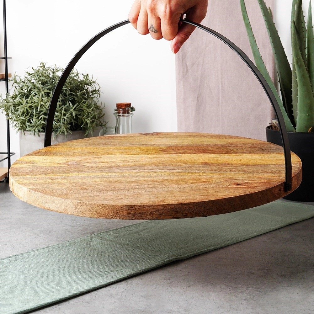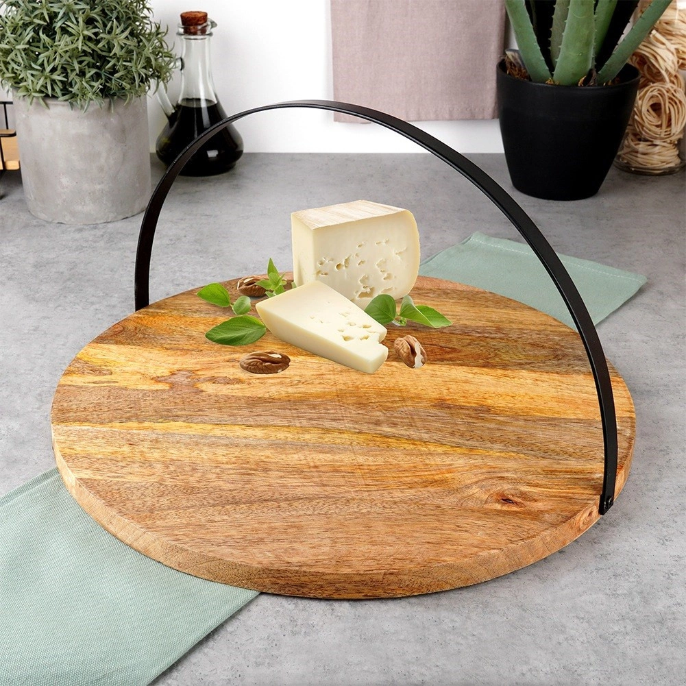 Stílusos szervírozó tálca mangófából, praktikus lehajtható fém fogantyúval a könnyű hordozáshoz és felakasztáshoz. Kerek forma és 38,5 cm átmérő bőséges helyet kínál sajtoknak, felvágottaknak vagy desszerteknek. Az ellenálló mangófa jobban tűri a nedvességet, nem deformálódik és gyorsan szárad. A tálca csúszásgátló filc talpakkal van ellátva a stabil és biztonságos használatért otthon és vendéglátásban is.