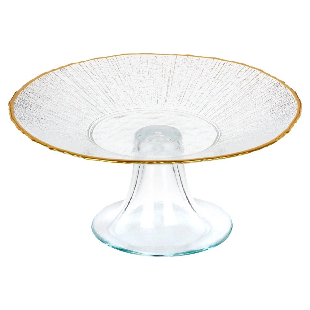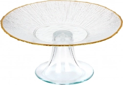 Ez a stílusos üveg tortaállvány letisztult dizájnjával, átlátszó üvegével és visszafogott arany szegélyével ünnepélyes hangulatot teremt. A megemelt, talpas kialakítás kényelmes szeletelést és tálalást biztosít, miközben kiemeli a desszerteket.