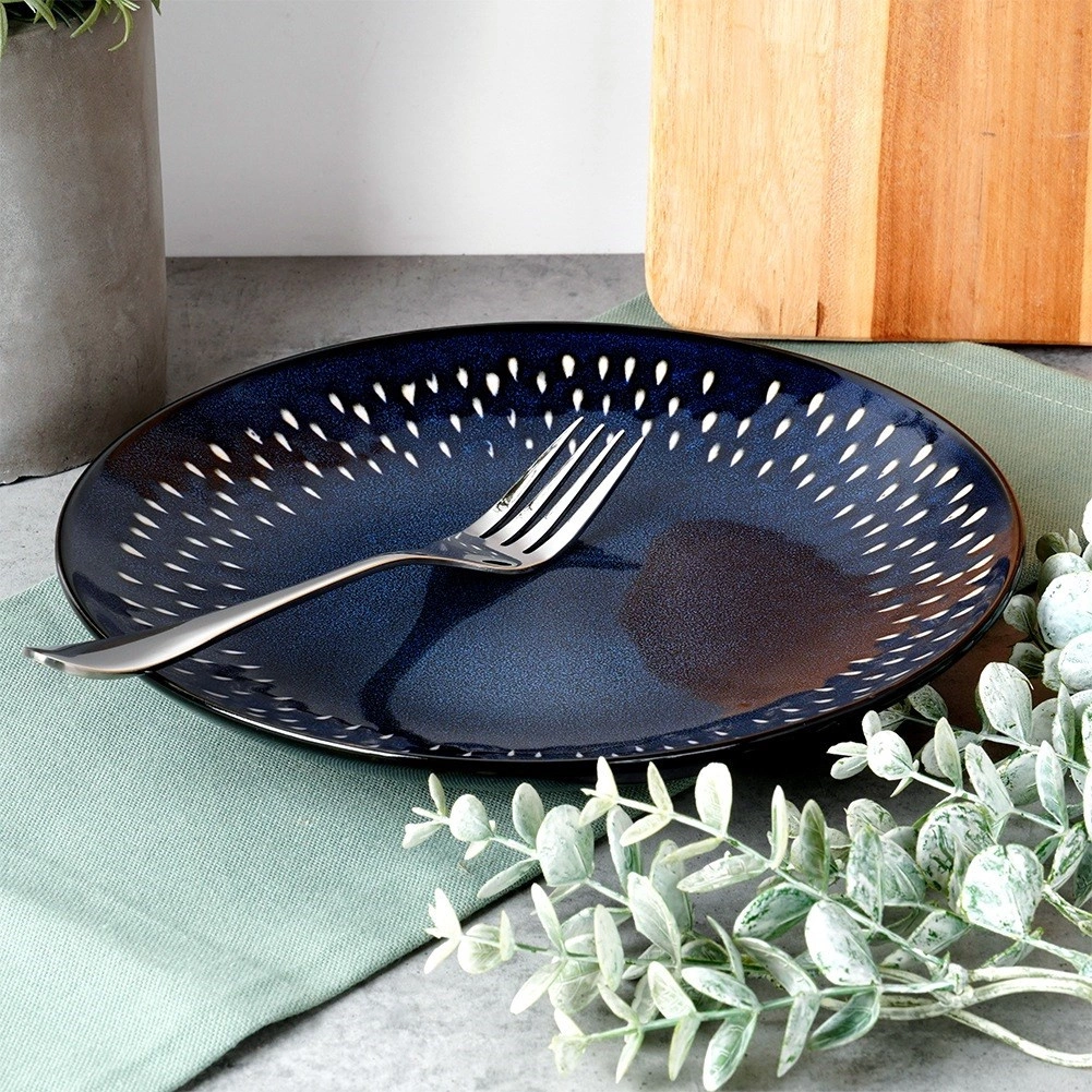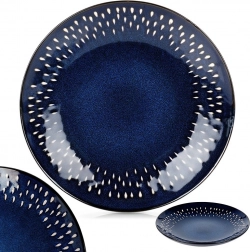 A mély kékes árnyalatú gránátvörös, a peremen körbefutó világos pöttyös díszítéssel modern és elegáns megjelenést kölcsönöz a megterített asztalnak. Könnyen kombinálható más kerámiákkal.