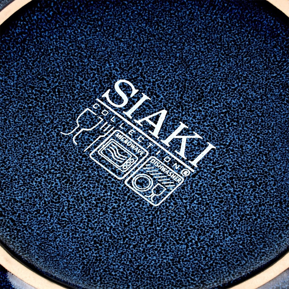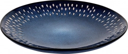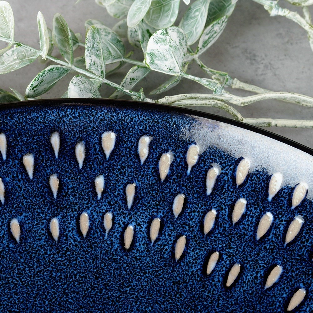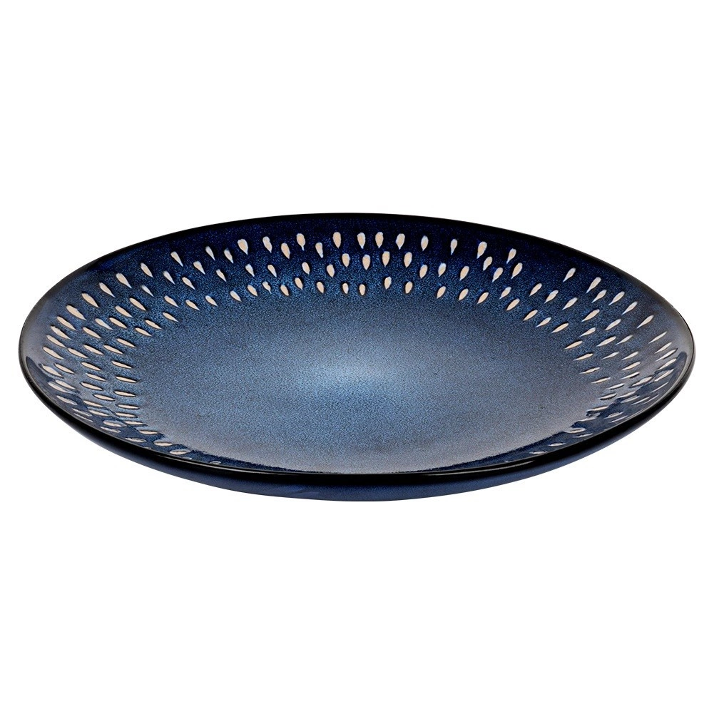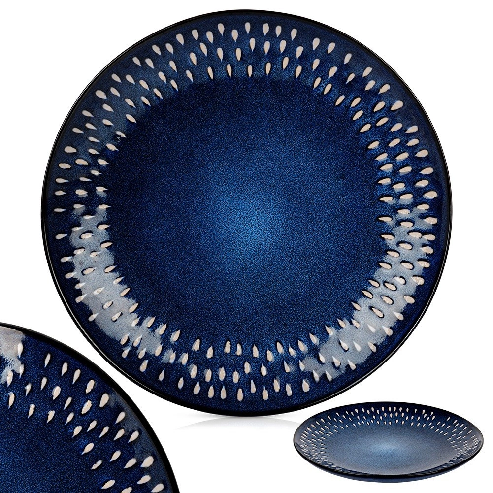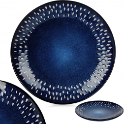 Elegáns, 28 cm átmérőjű lapostányér tartós kőedény kerámiából, sötétkék színben, dekoratív cseppmintával. Mindennapi étkezéshez és ünnepi alkalmakhoz egyaránt ideális, strapabíró, mosogatógépben mosható és mikrózható, remekül illik a modern terítékhez.