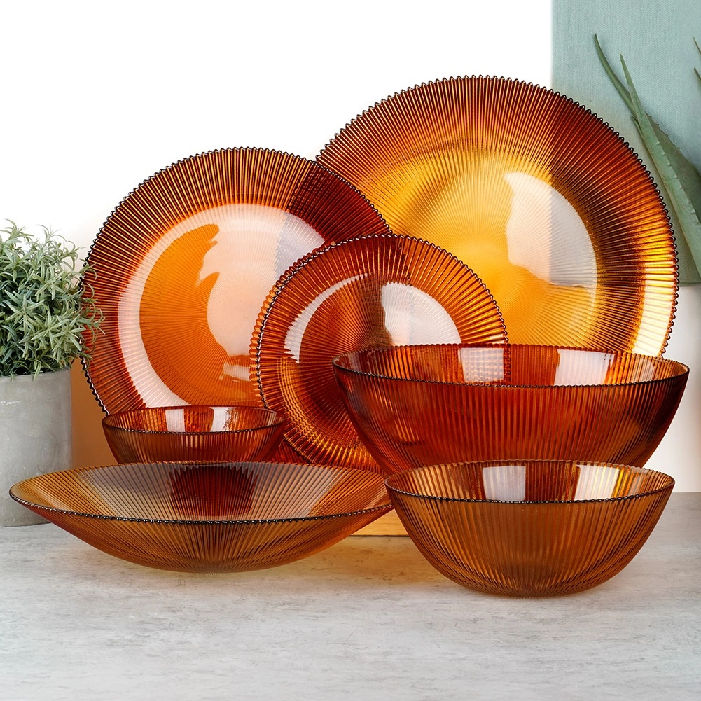 Ez a 28 cm-es borostyán üveg tányér a modern dizájnt funkcionalitással ötvözi. A középpontból induló radiális bordázat látványos megjelenést, jobb fogást és szép fényjátékot biztosít. Megállja a helyét a mindennapi terítésnél és ünnepi alkalmakon is.