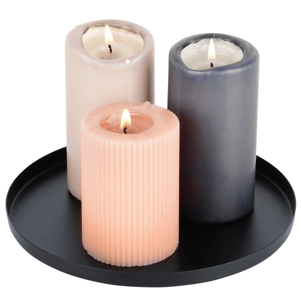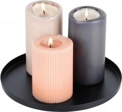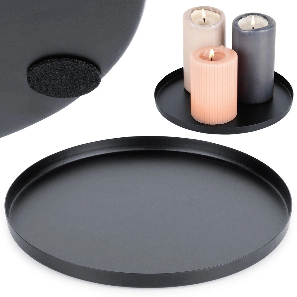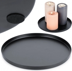 Stílusos, matt fekete fém tálca, ideális dekorációk és gyertyák alapjaként. Átmérője 21,5 cm, alacsony peremmel a viasz felfogására, az alján pedig védő filcpárnákkal. Minimalista dizájnja elegánsan kiemel minden kompozíciót, miközben védi a bútort a karcolásoktól és foltoktól.