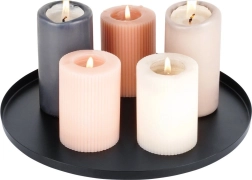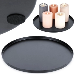Ez a minőségi, matt fekete fém tálca tökéletes gyertyák, dekorációk vagy ékszerek elrendezéséhez. 30 cm-es átmérője és finoman megemelt pereme stabilitást ad, és megóvja a felületeket a viasztól és a szennyeződésektől. Időtlen megjelenése könnyedén kombinálható különböző lakberendezési stílusokkal.