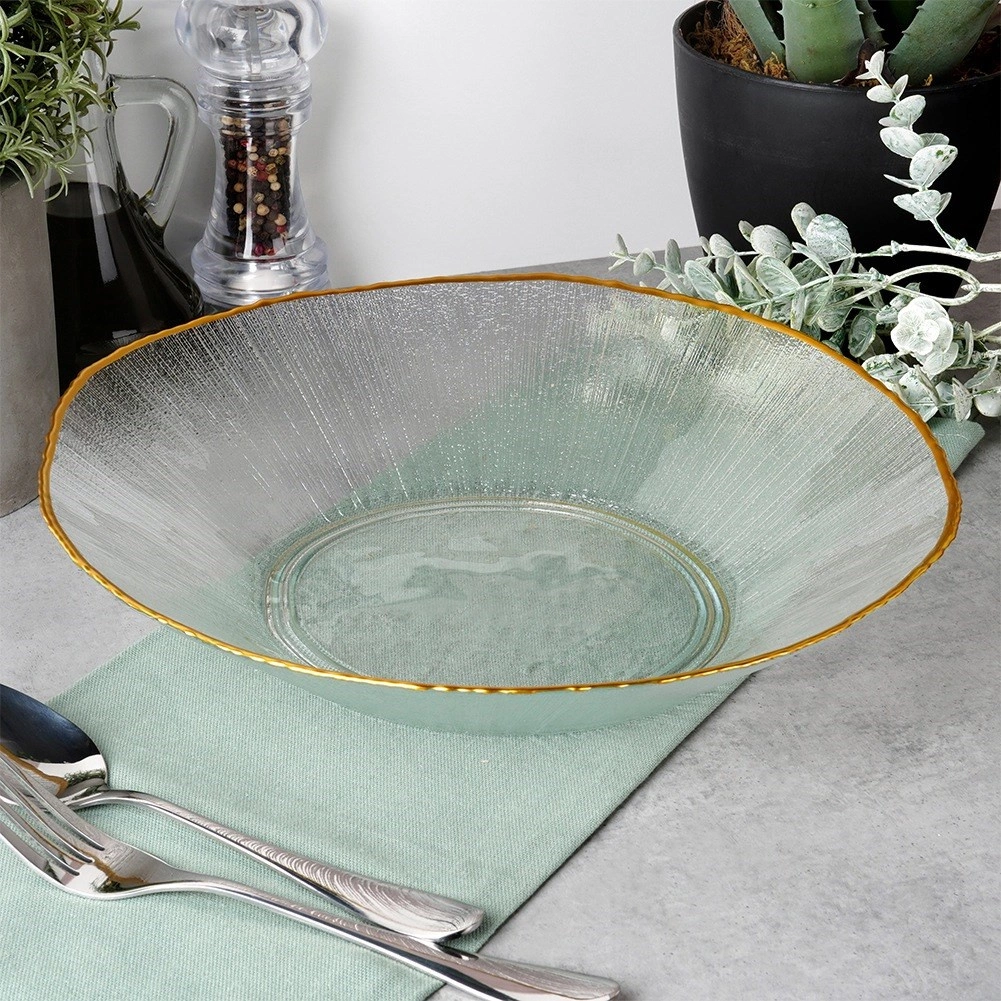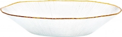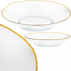 Elegáns üvegsalátástál 1,6 l űrtartalommal, aranyszegéllyel és finom textúrával, amely luxus érzetet kölcsönöz a terítéknek. Széles, lapos formája ideálissá teszi saláták, gyümölcsök és rágcsálnivalók tálalásához. Kiváló minőségű, átlátszó üvegből készült, kristályt idéző hatással; könnyen tisztítható, és megfelelő ápolással hosszú éveken át megőrzi szépségét.