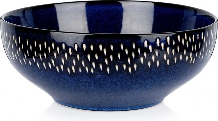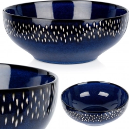 Elegáns kerámia salátástál 2,8 l űrtartalommal és 25 cm átmérővel, mély sötétkék mázzal és dekoratív cseppmintával. Tartós kőedényből (gres) készült, mosogatógépben és mikrohullámú sütőben egyaránt használható, ideális salátákhoz, tésztákhoz és rágcsálnivalók tálalásához. Stílusos kiegészítő minden asztalhoz, hosszú élettartammal és egyszerű karbantartással.