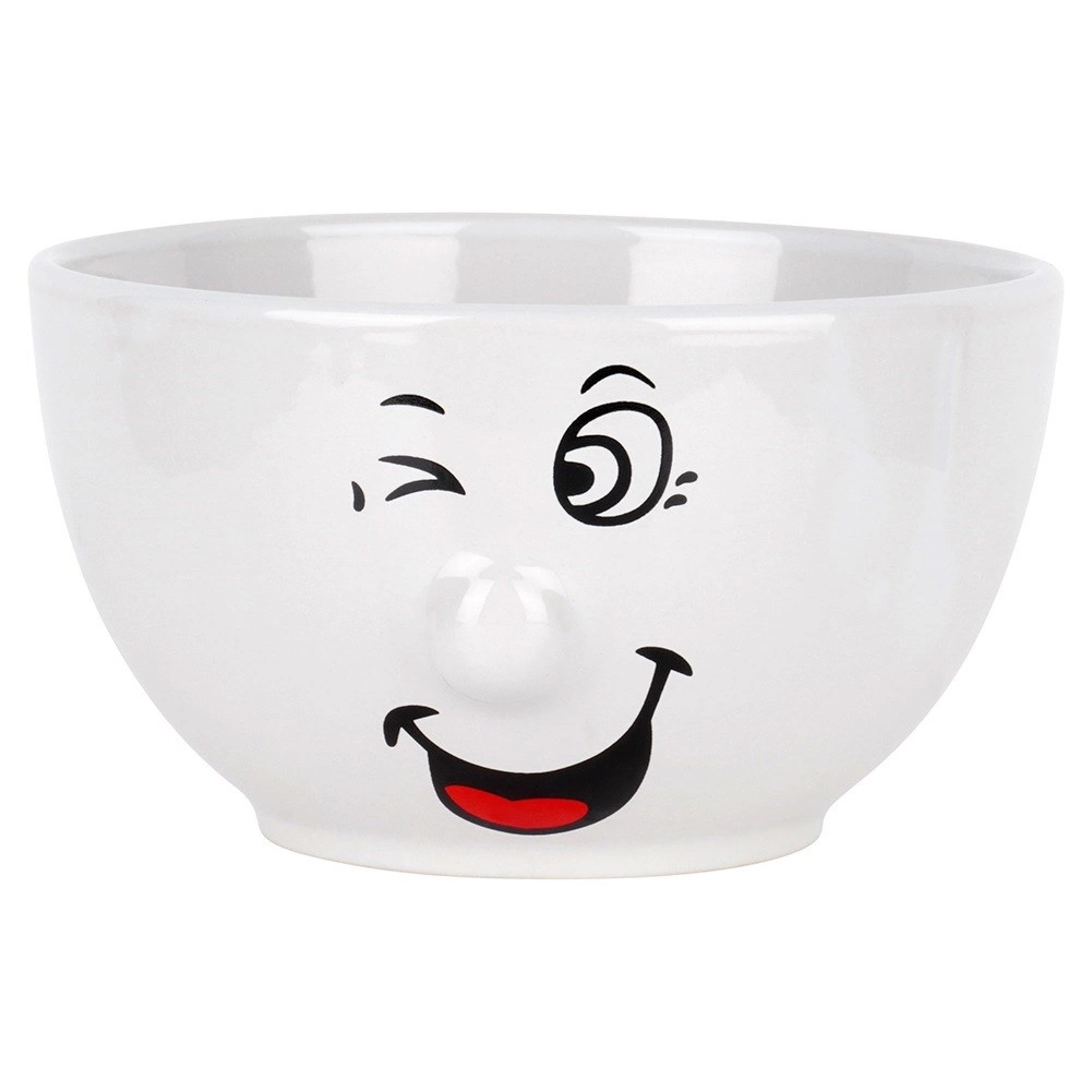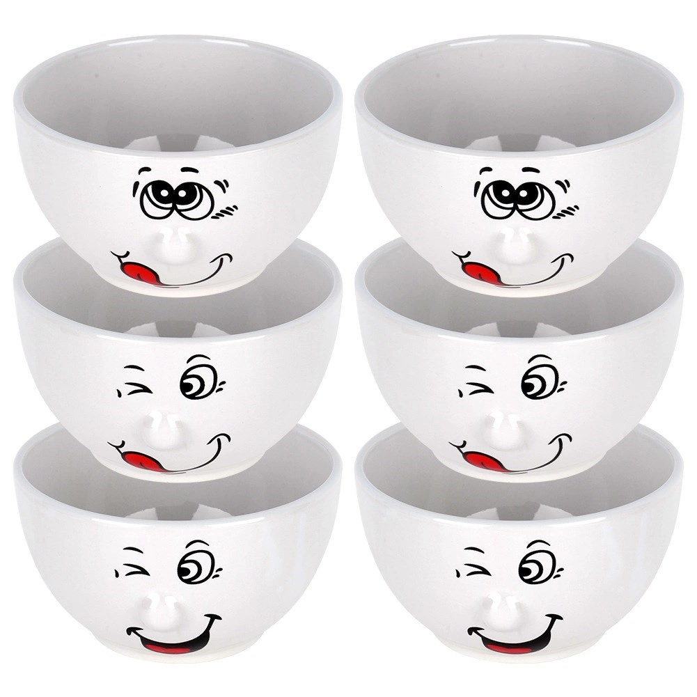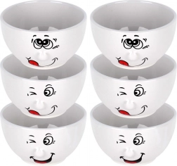 Praktikus és stílusos tálkészlet, amely humoros, arcokkal díszített dekorjával hívja fel magára a figyelmet, és sokoldalú felhasználást kínál a mindennapi tálaláshoz. A 550 ml-es űrtartalomnak köszönhetően ideális levesekhez, krémekhez, müzlihez, salátákhoz és apró rágcsálnivalókhoz. A fényes fehér kerámia bármely konyhában jól mutat, és könnyen kombinálható más edényekkel.