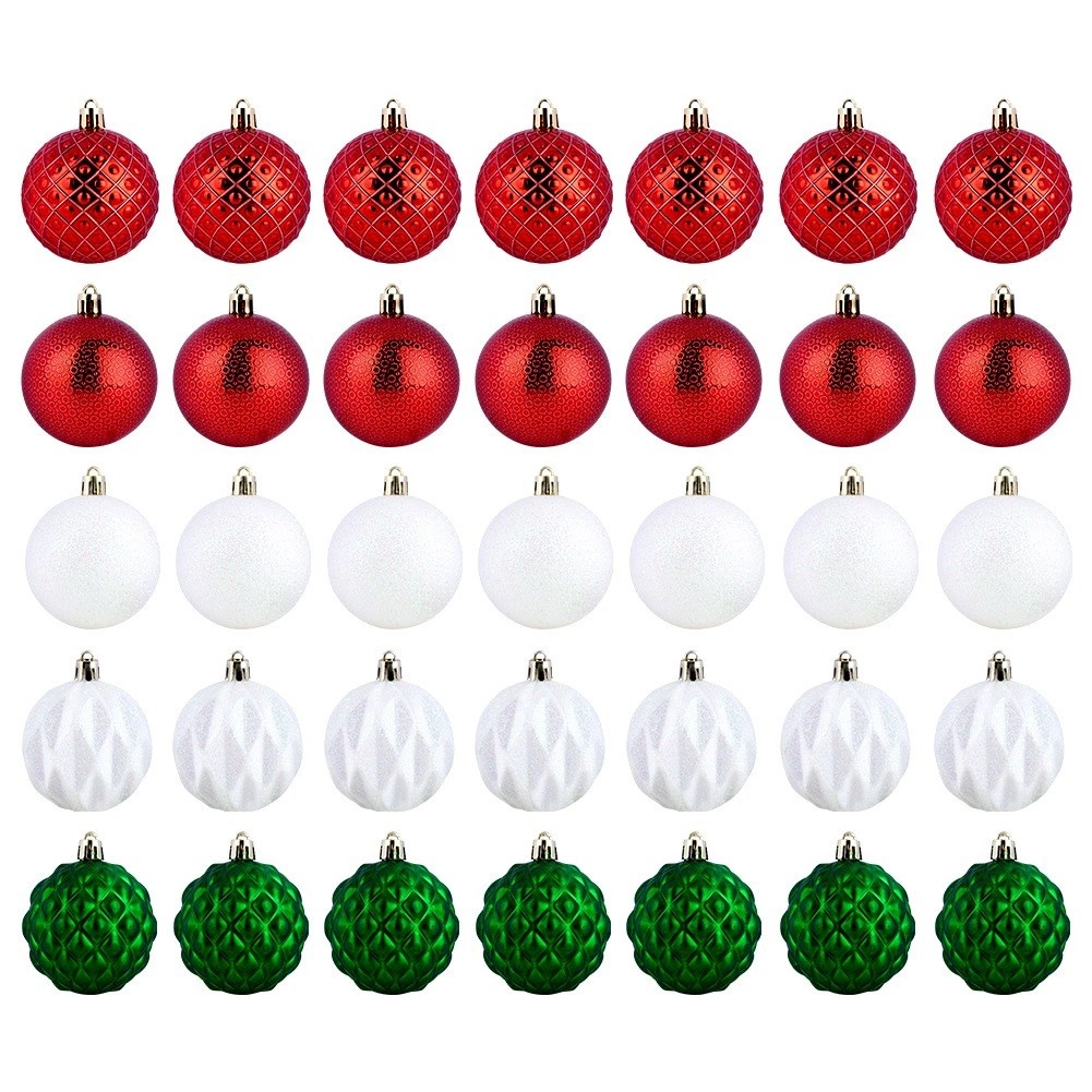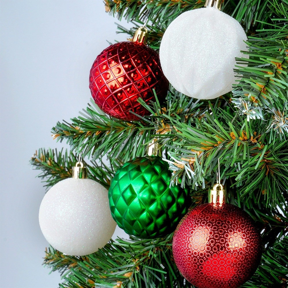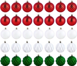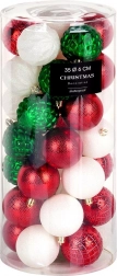 Praktikus csomagolásban 35 darab, 6 cm átmérőjű gömb piros, zöld és fehér színben, akasztózsinórokkal a gyors és egyszerű dekoráláshoz.