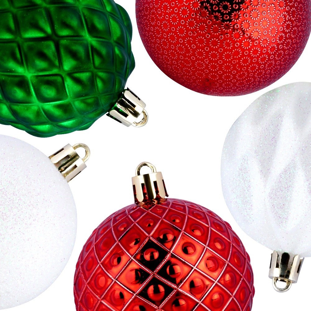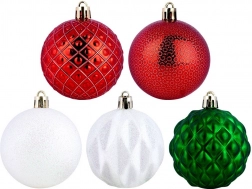 Elegáns készlet 35 törhetetlen karácsonyi díszből piros, zöld és fehér színekben, változatos felületekkel – fényes, matt, csillámos, dombor. A 6 cm átmérőjű gömbök biztonságosan díszítik a fát, koszorúkat és girlandokat, és varázslatos karácsonyi hangulatot teremtenek. A csomag tartalmaz akasztózsinórokat is.