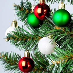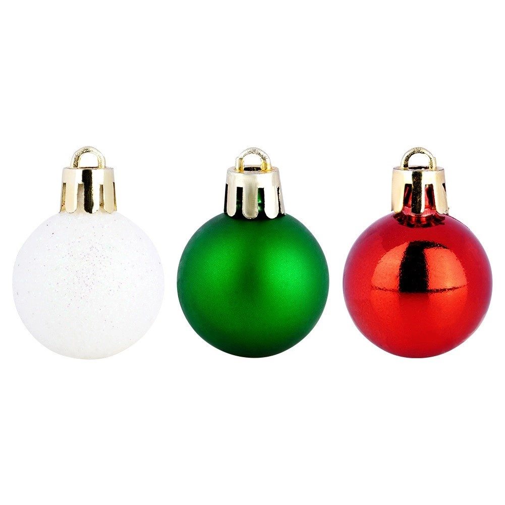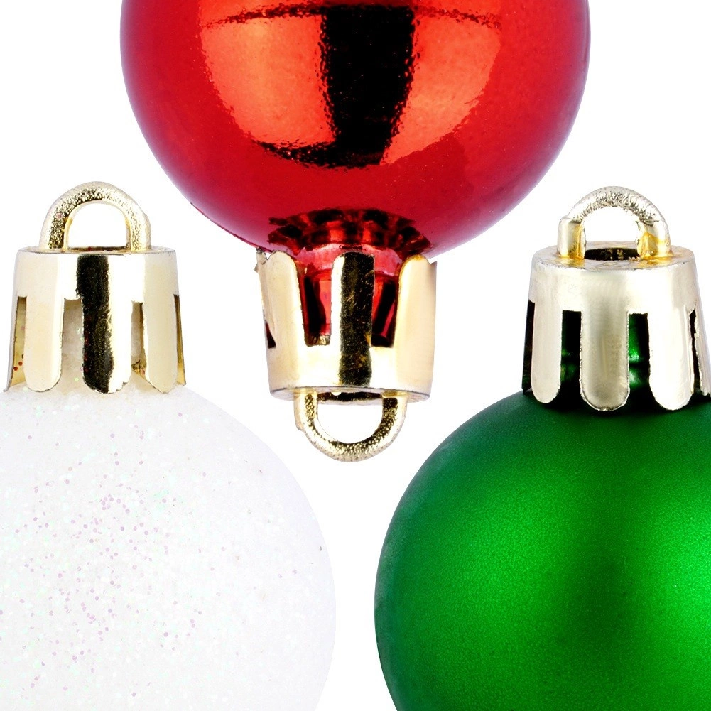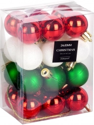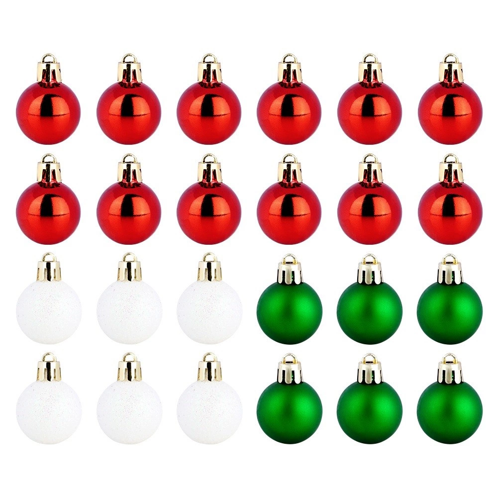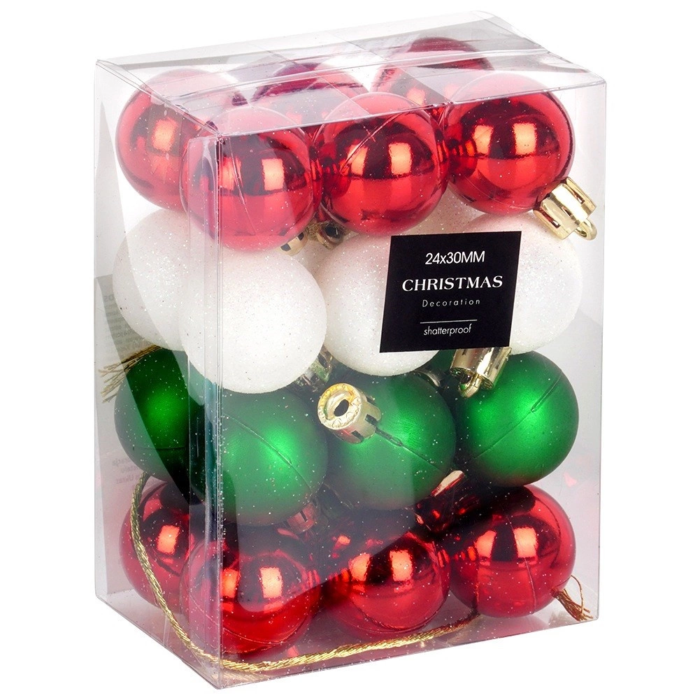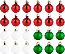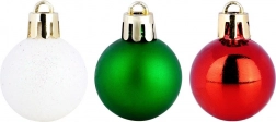 Ez az elegáns készlet 24 kis karácsonyi gömböt tartalmaz hagyományos színekben – piros, zöld és fehér. A törésbiztos műanyagnak köszönhetően a díszek könnyűek, tartósak és biztonságosak, megjelenésük pedig az üveget idézi. A fényes, matt és csillogó felületek kombinációja harmonikus, ragyogó hatást kelt bármelyik fán.
