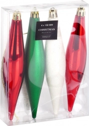 Elegáns, négydarabos karácsonyi díszkészlet csepp alakban, piros, zöld és fehér színekben, amely ragyogó fényt és ünnepi hangulatot kölcsönöz dekorációdnak. A díszek törhetetlenek, könnyűek és biztonságosak gyermekes vagy háziállatos otthonokban is. A fényes, matt és csillogó felület kombinációja stílusos változatosságot biztosít a fára, koszorúkra és girlandokra.
