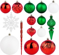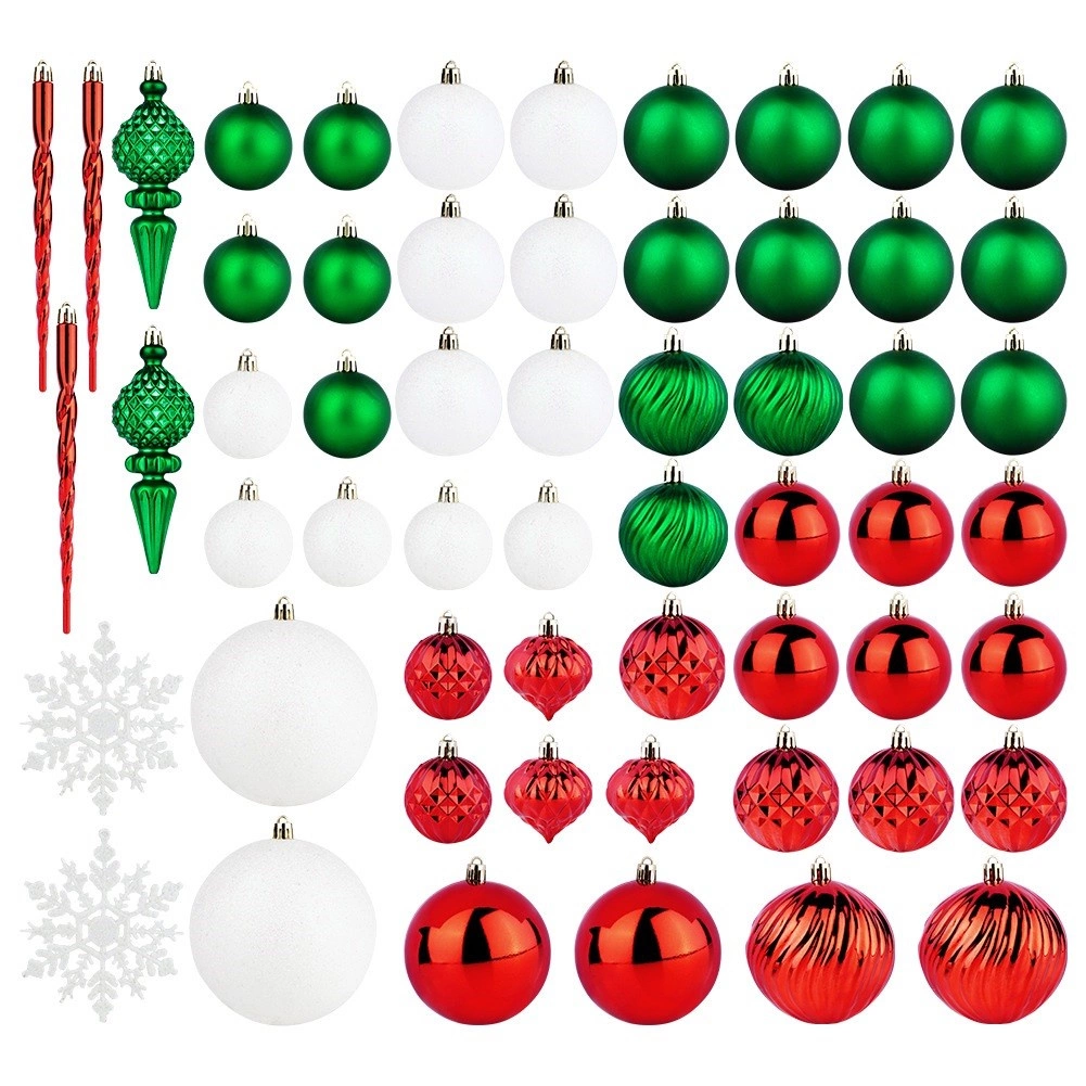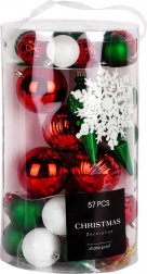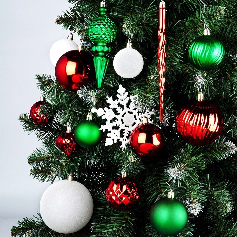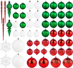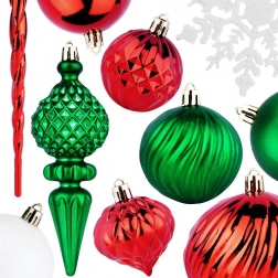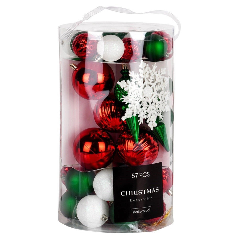 Stílusos 57 darabos törhetetlen karácsonyi díszkészlet piros, zöld és fehér színekben, amely beragyog minden fát. A fényes, matt, csillogó és domborított felületek változatos keveréke gazdag, klasszikus megjelenést ad. A tartós műanyagból készült díszek gyerekek és háziállatok számára is biztonságosak, akasztófüllel rendelkeznek az egyszerű felhelyezéshez, és praktikus tárolócsomagolásban érkeznek.