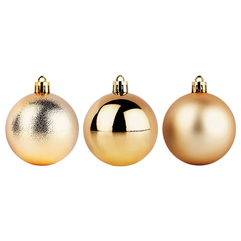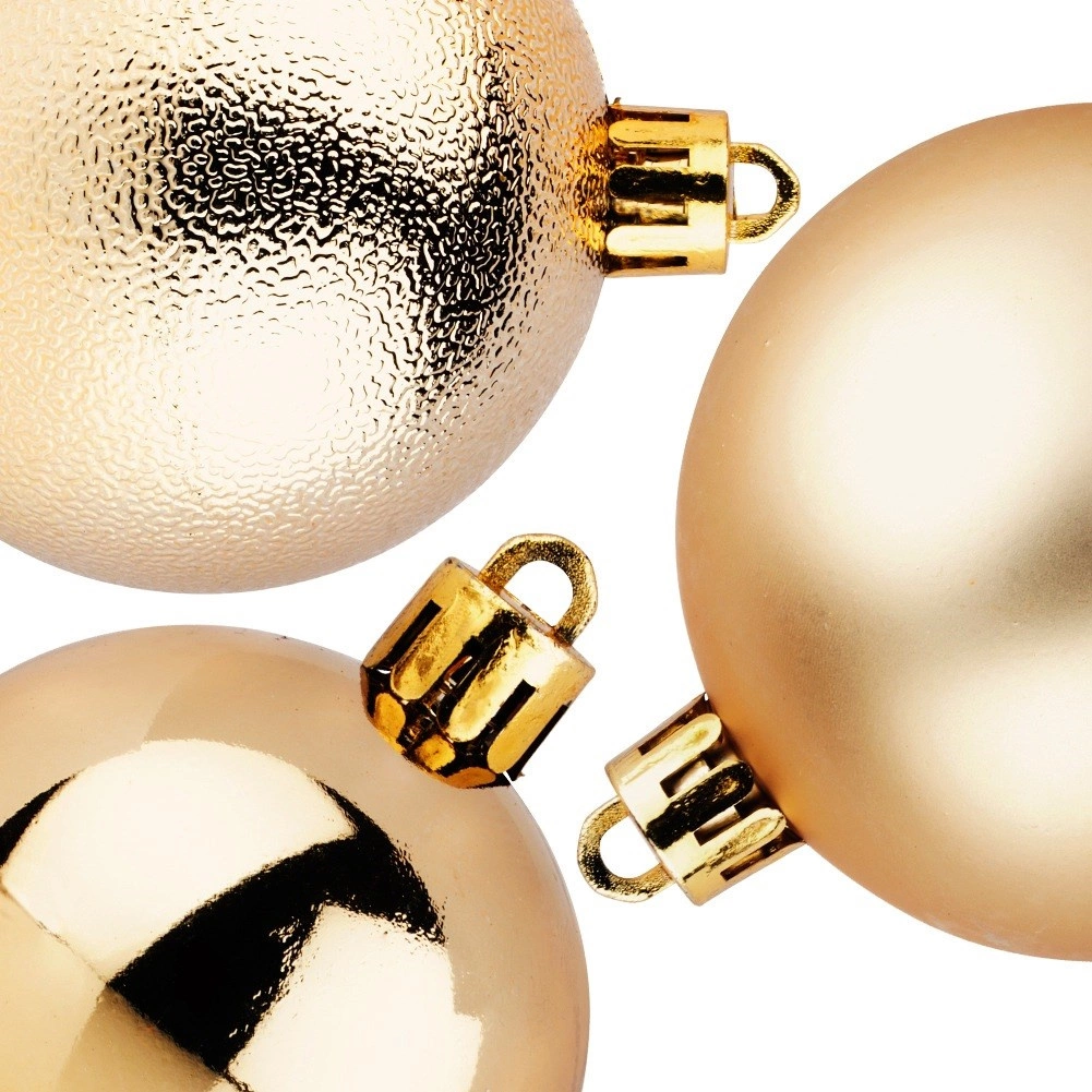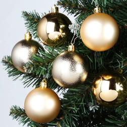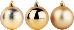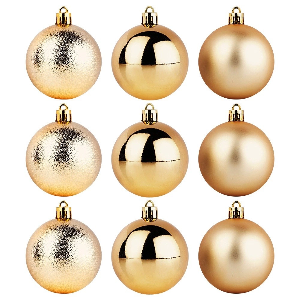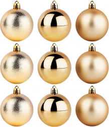 Elegáns, 9 darabos arany karácsonyi gömbkészlet 6 cm átmérővel, amely díszítésének klasszikus fényt és ünnepi hangulatot ad. A készletben fényes, matt és strukturált felületek találhatók egységes arany árnyalatban. A gömbök törhetetlen, minőségi műanyagból készültek, biztonságosak gyermekek és háziállatok mellett is, a csomag tartalmaz akasztózsinórokat is.