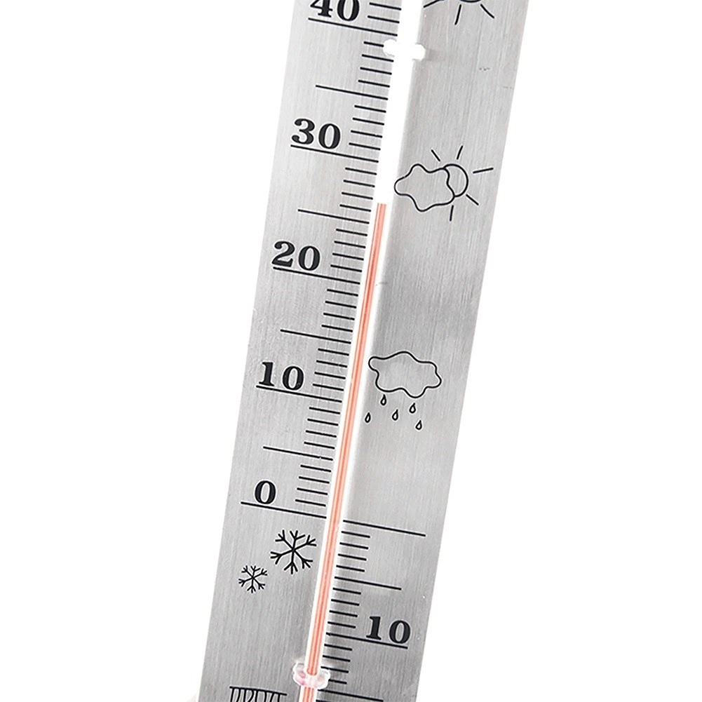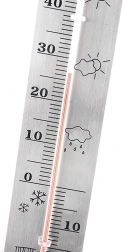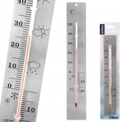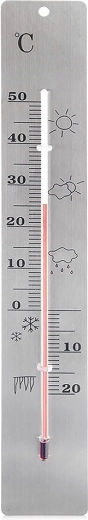 Klasszikus analóg hőmérő beltéri és kültéri hőmérséklet méréséhez, -20 °C-tól 50 °C-ig terjedő tartománnyal. Elegáns ezüstszínű rozsdamentes acélból készült, higanymentes (gázolajos töltettel). A jól olvasható skála és a falra akasztható kialakítás révén erkélyre, teraszra, kertbe és beltérbe egyaránt alkalmas. Méretek: 4,5 × 28 cm.