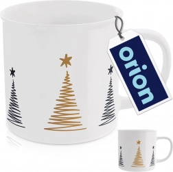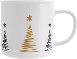 Stílusos, 500 ml űrtartalmú kerámia bögre minimalista karácsonyi fenyőkkel fekete és arany színben. A praktikus fülnek köszönhetően kényelmes a fogása, mosogatógépben és mikrohullámú sütőben is használható, és ideális kávéhoz, teához és kakaóhoz.