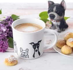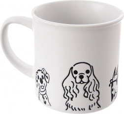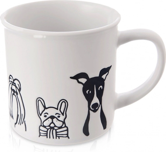 Stílusos, fehér színű 500 ml űrtartalmú kerámia bögre különböző kutyafajták motívumával. Kényelmes füllel rendelkezik, mosogatógépben és mikrohullámú sütőben is használható, és klasszikus dizájnjának köszönhetően mindennapi használatra is ideális. Tökéletes teához, kávéhoz és kakaóhoz.