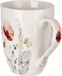 Elegáns porcelán bögre 360 ml űrtartalommal és pipacsos virágmintával, ideális kávéhoz, teához és kakaóhoz. Fehér, minőségi porcelán, mosogatógépben és mikrohullámú sütőben használható, kényelmes füllel és klasszikus formával a mindennapi használathoz.