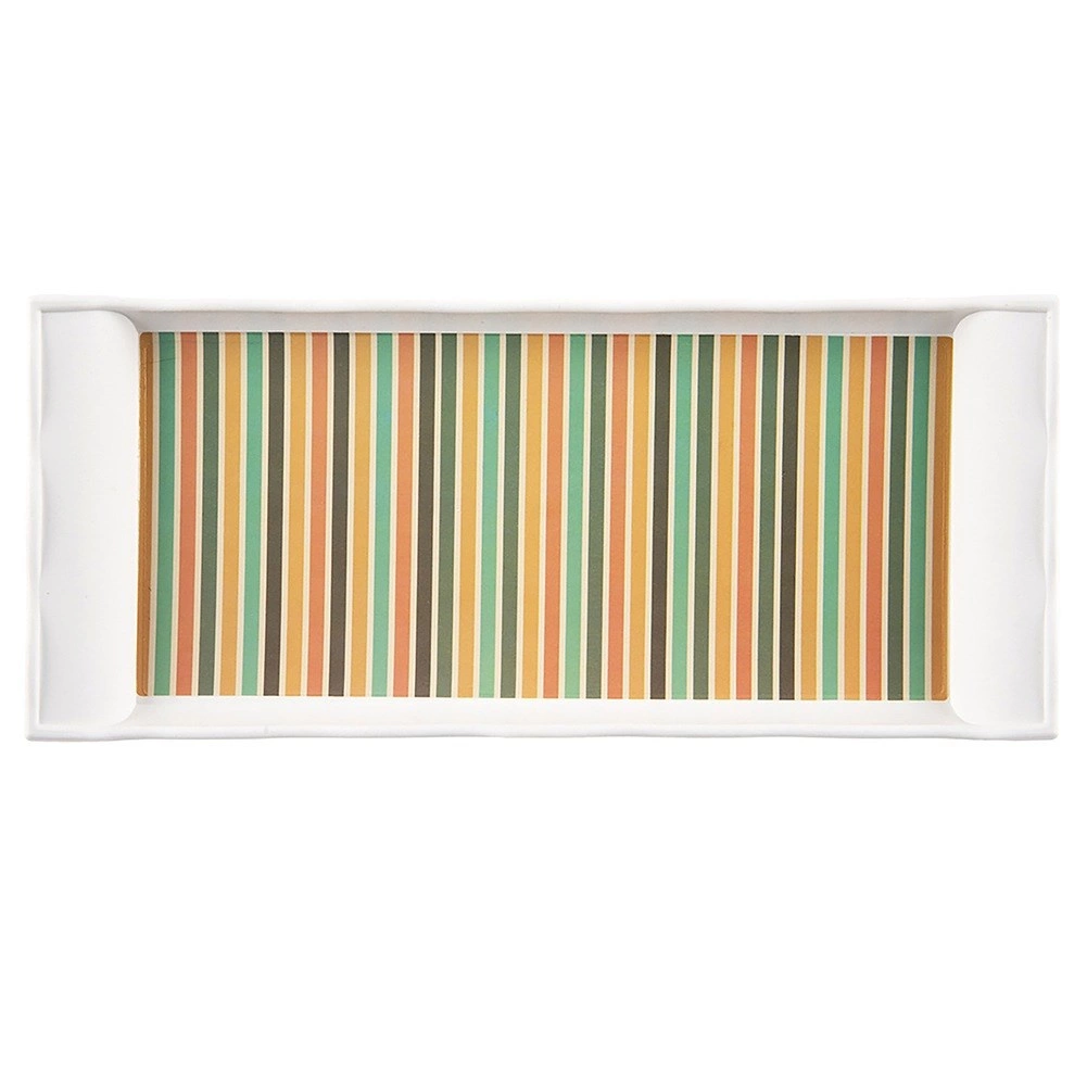 Stílusos szervírozótálca 29,5 × 13 × 3 cm méretben, amely megkönnyíti az italok és desszertek felszolgálását otthon és vendéglátásban. Megemelt, hullámos peremei vannak a biztonságos hordozáshoz, stabil, csúszásgátló felület és könnyű tisztíthatóság jellemzi. A belső részt színes csíkok díszítik, amelyek friss megjelenést kölcsönöznek a tálalásnak.