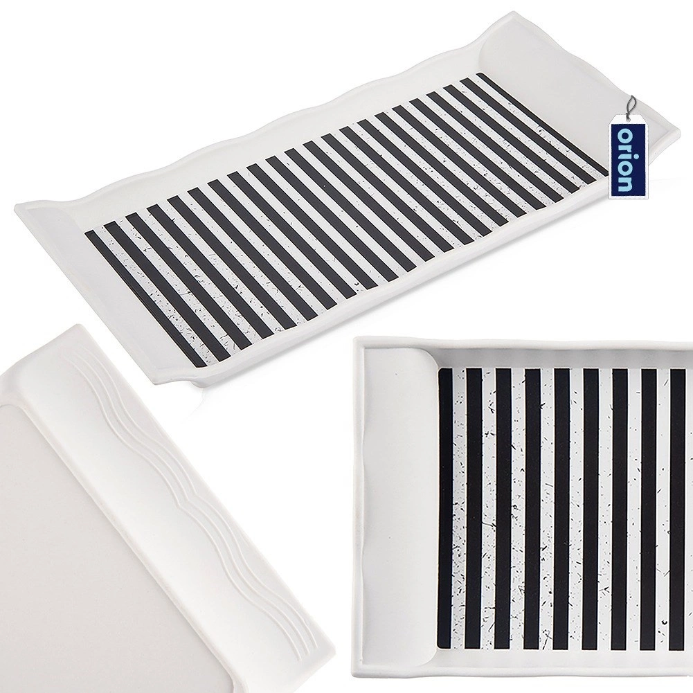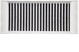 Elegáns, téglalap alakú szervírozótálca 29,5 × 13 × 3 cm méretben, kényelmes kávé, tea, desszertek és snackek tálalásához. A csúszásmentes, csíkozott felületnek köszönhetően az italok és tányérok stabilak maradnak szállítás közben. A tálca strapabíró műanyagból készült fehér színben, könnyen tisztítható, és alkalmas otthoni és vendéglátóipari felhasználásra is.
