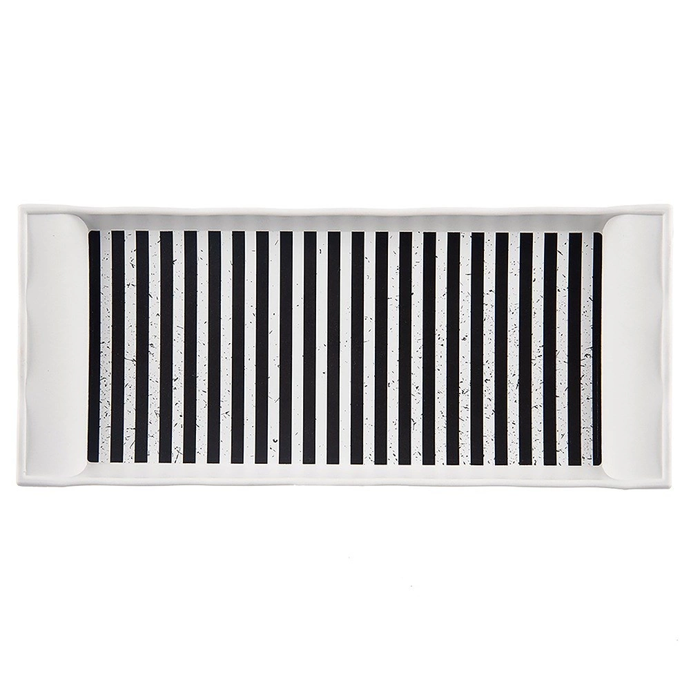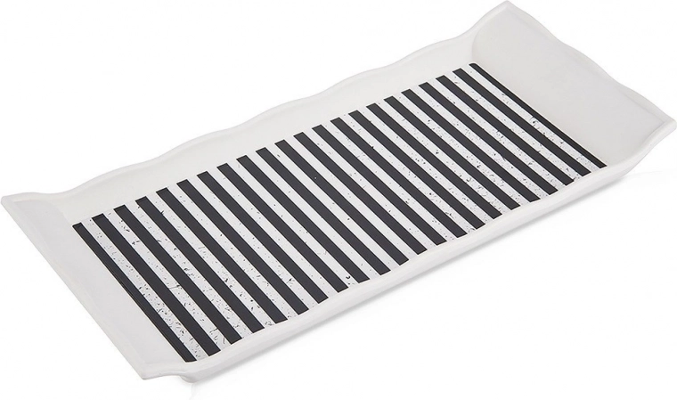 Stílusos és praktikus szervírozótálca kontrasztos fekete-fehér csíkokkal, amely biztosan a helyén tartja a csészéket, poharakat és tányérokat. A magas peremek megkönnyítik a biztonságos hordozást, a sima felület pedig gyors és egyszerű tisztítást tesz lehetővé. Kiválóan alkalmas kávéhoz, teához, süteményekhez és apró harapnivalókhoz.