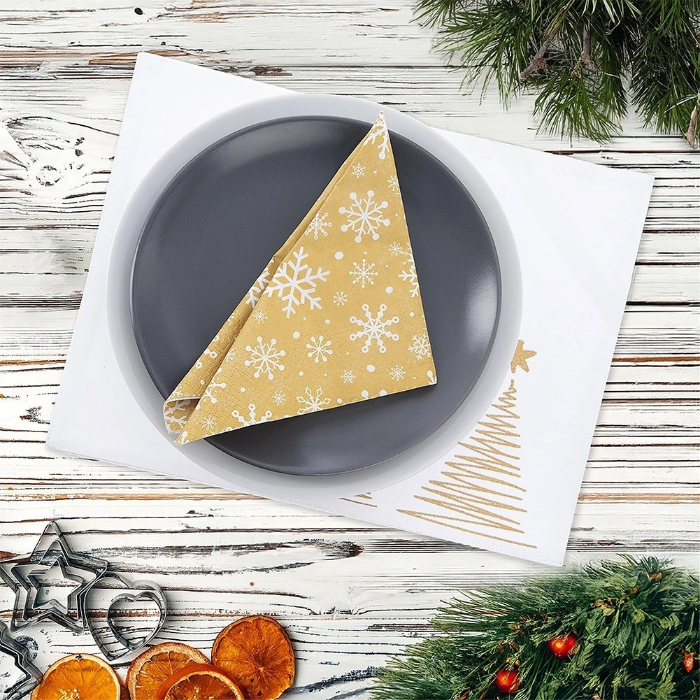 Ez a pamut alátét ünnepi és hétköznapi terítékhez egyaránt remek választás. A fehér alap arany karácsonyfamintával harmonikus, elegáns környezetet teremt a tálaláshoz. A 33,5 × 26 cm-es méretnek köszönhetően kiválóan illik tányérok, csészék és desszertes tányérok alá, egységes megjelenést adva a terítéknek.