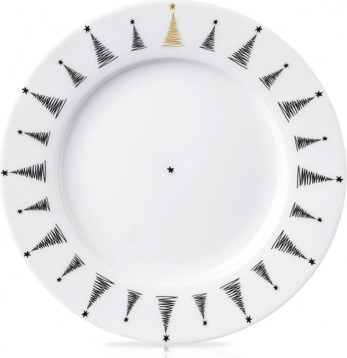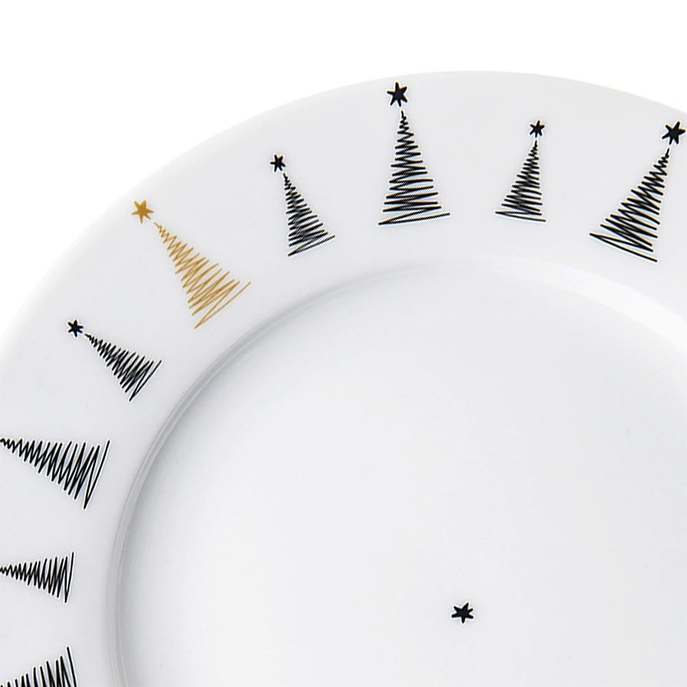 Vigyen ünnepi hangulatot az asztalára ezzel a 20 cm átmérőjű porcelán desszerttányérral. A fehér, mázas felületet minimalista fenyők díszítik fekete és arany színekben, modern és időtálló megjelenéssel. A tányér ideális tortácskákhoz, pitékhez, gyümölcshöz és kisebb sós falatokhoz.