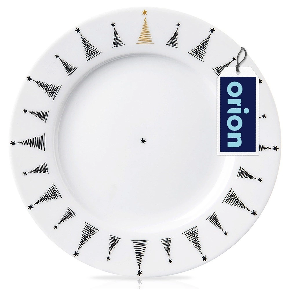 Elegáns, 20 cm átmérőjű desszerttányér minőségi porcelánból, karácsonyi fenyőmintával fekete és arany színekben. Ideális desszertek, sütemények és uzsonnák tálalásához, mosogatógépben és mikrohullámú sütőben is használható, és remekül kiegészíti ünnepi és mindennapi terítékét. Eredeti ORION termék.