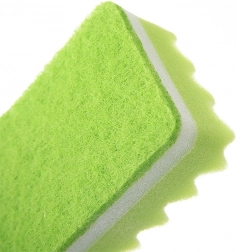 A puha, hullámos oldal védi az érzékeny felületeket, míg az abrazív réteg megbirkózik az odakozmált és rászáradt szennyeződésekkel.