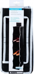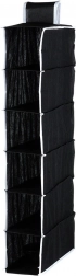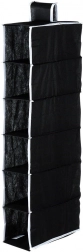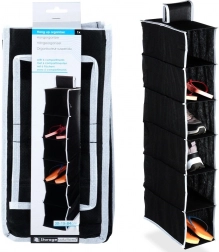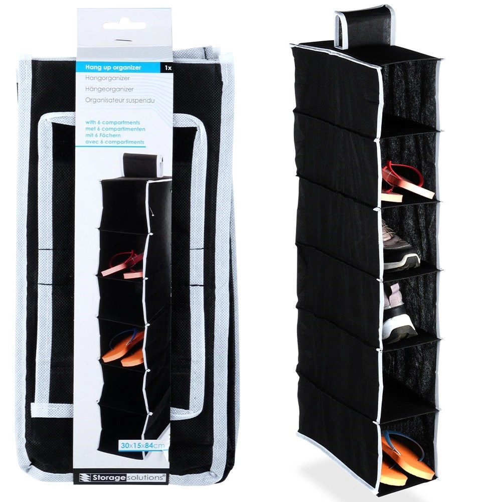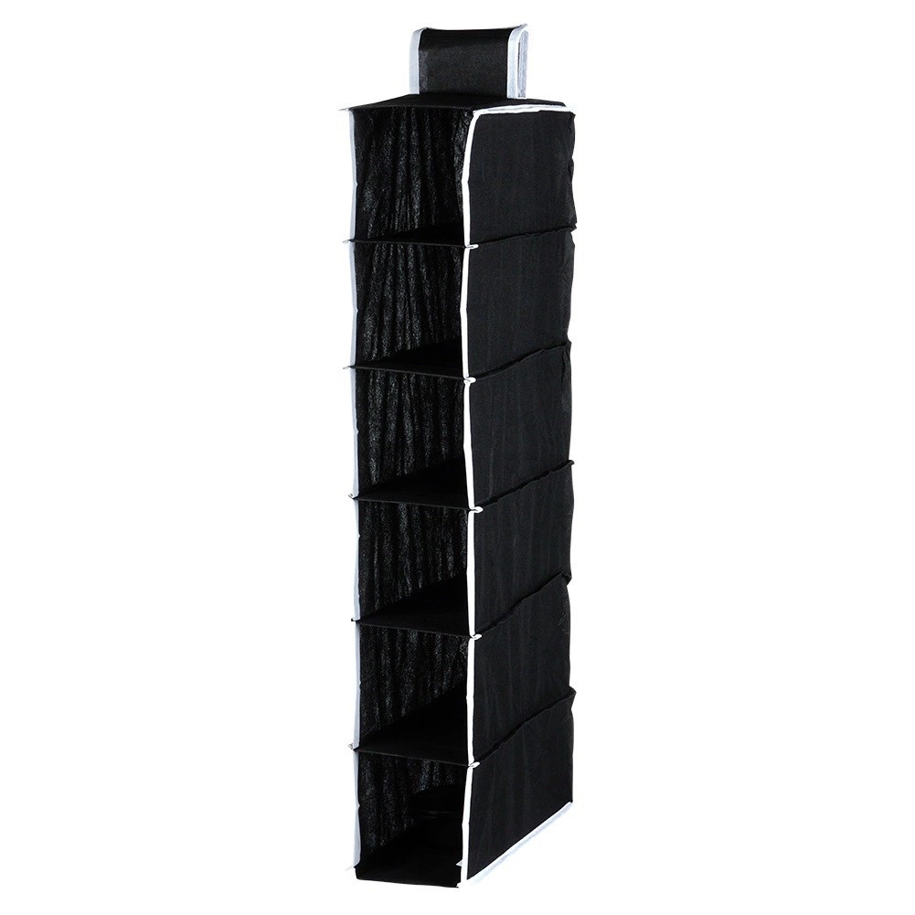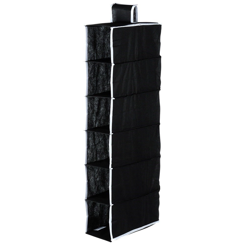 Maximalizálja a szekrény tárolóterét a kompakt akasztós rendezővel, amely 6 tágas polcot kínál a cipők, pólók, törölközők vagy divatkiegészítők átlátható tárolásához. A fekete kivitel kontrasztos szegéllyel modern és univerzális hatást kelt bármilyen enteriőrben.