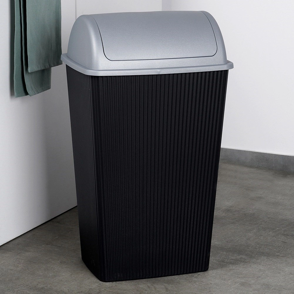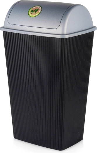 A szemetes teste minőségi műanyagból készült, 90%-ban újrahasznosított anyagok felhasználásával. A matt fekete, markánsan barázdált felület karcálló és esztétikus megjelenést biztosít. A szemetes könnyen tisztán tartható, stabil, és téglalap alakú alapjának köszönhetően egyszerűen a fal mellé vagy a sarokba helyezhető.