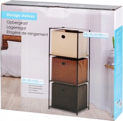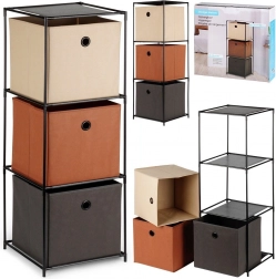 Ez a keskeny állvány, 34,5 × 34,5 × 100 cm-es méretekkel, tartós fekete fém vázzal és három textil boxszal (bézs, barna és antracit színekben) készül. Mindegyik boxon fém szem található a könnyű kezelhetőséghez, és összehajtható, így használaton kívül nem foglal helyet. Ideális megoldás az átlátható válogatáshoz és tároláshoz.