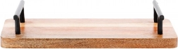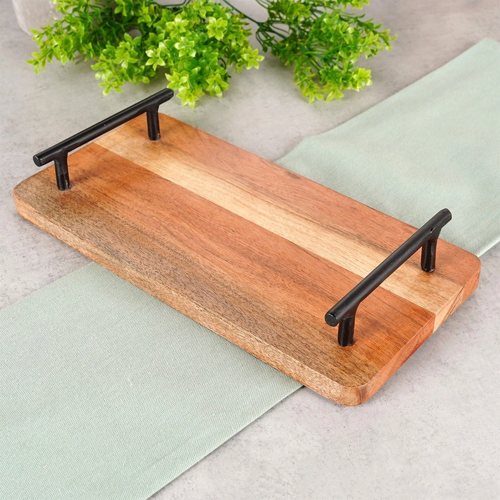 Stílusos akáciafából készült fa tálca két fekete fém fogantyúval a kényelmes hordozáshoz. Ideális mindennapi használatra és ünnepi tálaláshoz. Méretek: 30 × 15,5 × 5 cm, természetes felület, strapabíró kivitel és sokoldalú felhasználás a reggelitől a desszertekig.